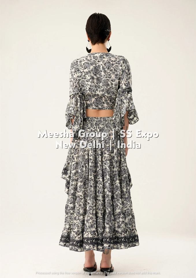 ชุดกระโปรงแม็กซี่พิมพ์ลายสำหรับผู้หญิง – เสื้อคอวีผูกโบโฮพร้อมชายระบายสูงต่ำ ชุดฤดูร้อน – คละสี