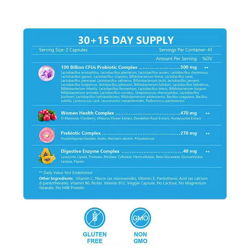 100 Billion CFUs Probiotic Complex, Women Health Complex, Digestive Enzyme Complex, Vitamin C, Niacin, Vitamin E, Pantothenic Acid, Vitamin B6, Biotin, Vitamin B12, Prebiotics Complex
