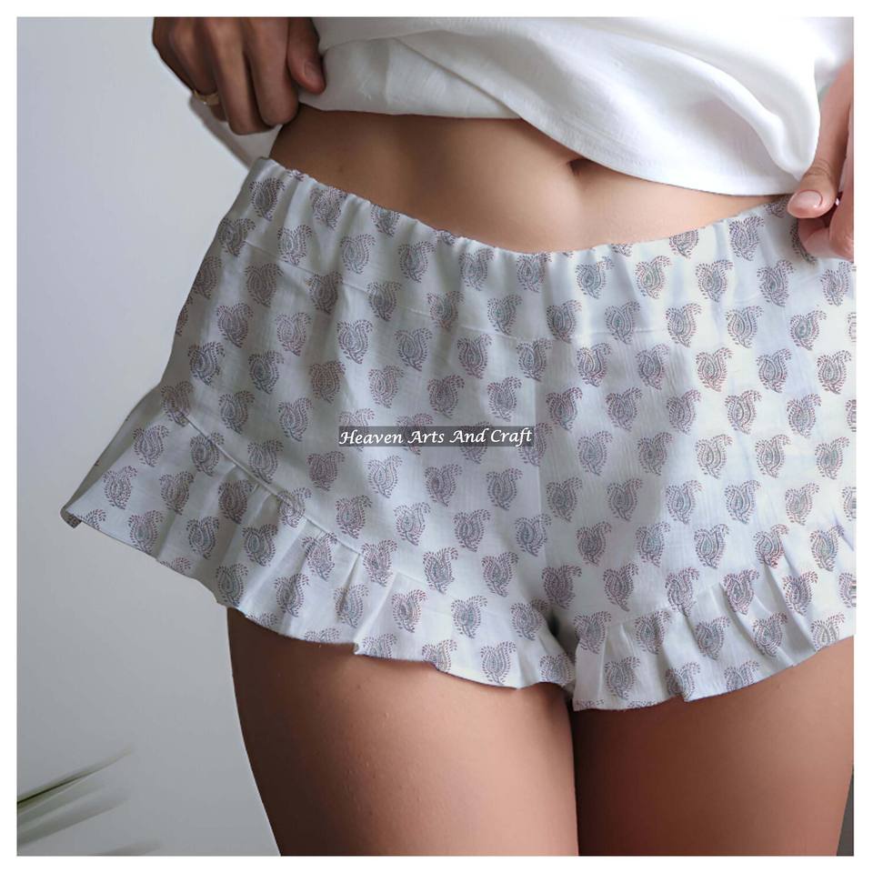 ชื่อสินค้า:กางเกงขาสั้นผ้าฝ้าย 100% พิมพ์ลายบล็อกมือ แต่งระบาย