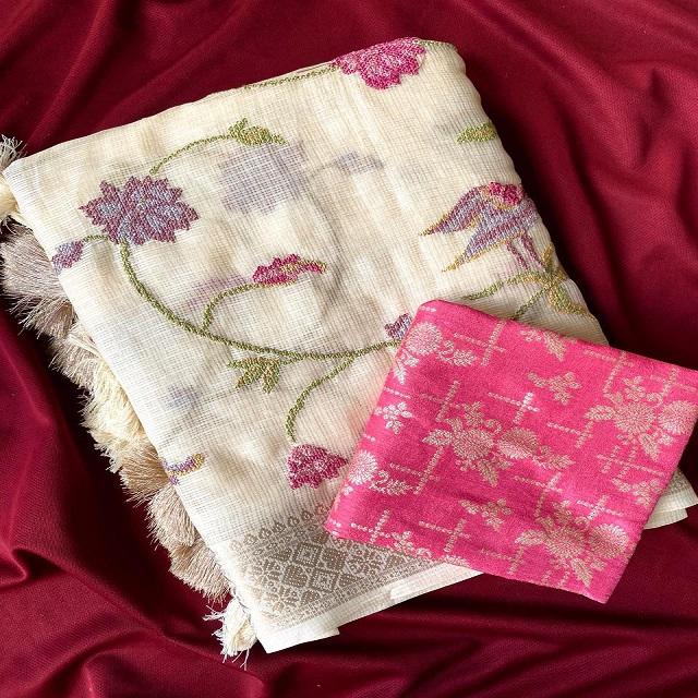 ผ้าส่าหรีโคตาสำหรับผู้หญิง พร้อมงานปักสวยงามบนผ้าส่าหรี และพู่ห้อยขอบผ้าวิสโคสแบบบาเนราสี