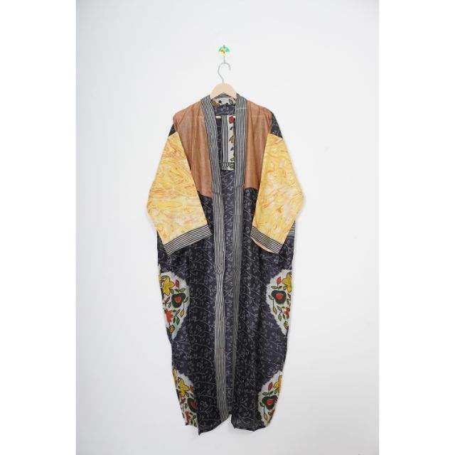 ชุดคลุมยาวผ้าไหมแท้สำหรับผู้หญิง ชุดนอนทำมือสไตล์อินเดีย ชุดเดรสยาวแบบกิโมโน ระบายอากาศได้ดี เหมาะสำหรับฤดูใบไม้ผลิ ฤดูร้อน ฤดูใบไม้ร่วง ลายปะติด คอวี ของขวัญ