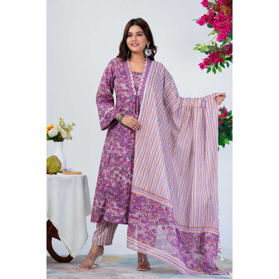 Kurta พิมพ์ลายดอกไม้สีม่วงกับคอวีและแขนกระดิ่ง3/4thคุรุต้า