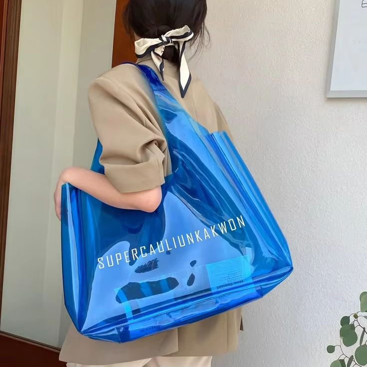 กระเป๋าถือสะพายไหล่กันน้ำ PVC สีม่วงสำหรับผู้หญิง พร้อมโลโก้แบบกำหนดเอง สไตล์แฟชั่น