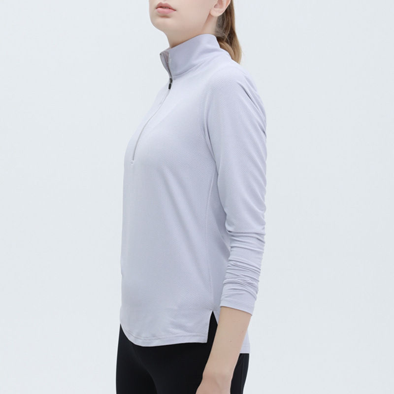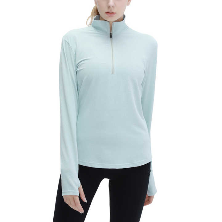 เสื้อครอปแขนยาวซิปครึ่งตัวสำหรับผู้หญิงเสื้อครอปท็อปไร้รอยต่อคอตั้งแห้งเร็ว