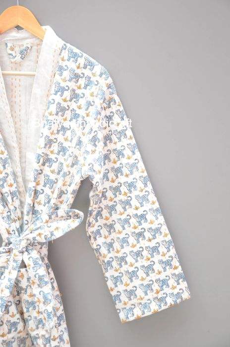 เสื้อคลุมผ้าควิลท์สำหรับผู้หญิง ระบายอากาศได้ดี เป็นมิตรกับสิ่งแวดล้อม เหมาะสำหรับฤดูหนาว ทำด้วยมือจากผ้าฝ้ายคันธา พร้อมเข็มขัดลายดอกไม้ เสื้อคลุมยาวแบบ unisex ซับในผ้าฝ้าย เหมาะสำหรับใส่ในบ้าน