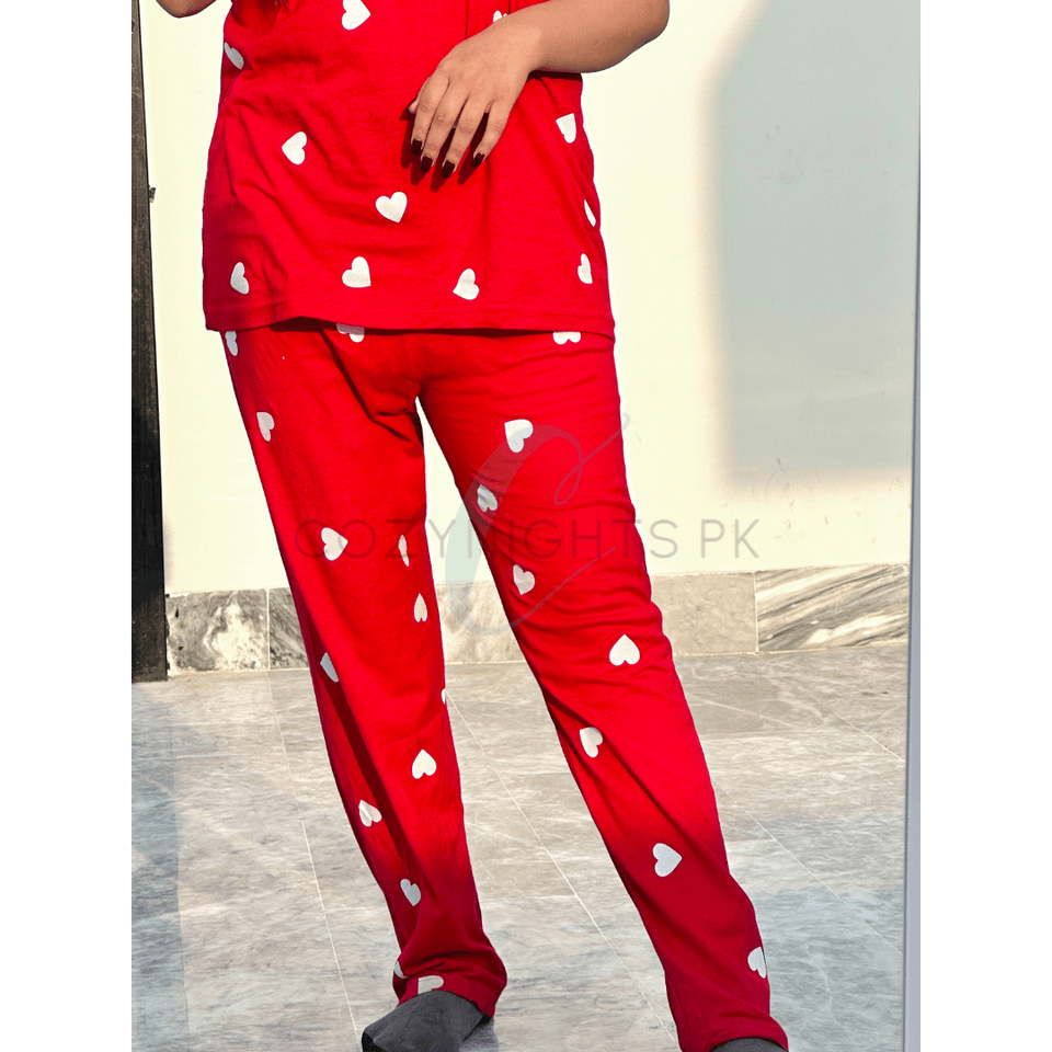 เสื้อยืดแขนครึ่งพิมพ์ลายหัวใจสีแดงของผู้หญิงพร้อมชุดนอนพิมพ์ลาย (CN-PNW-025)