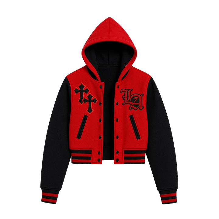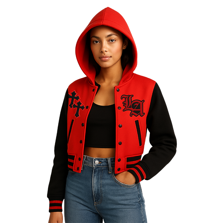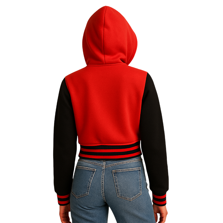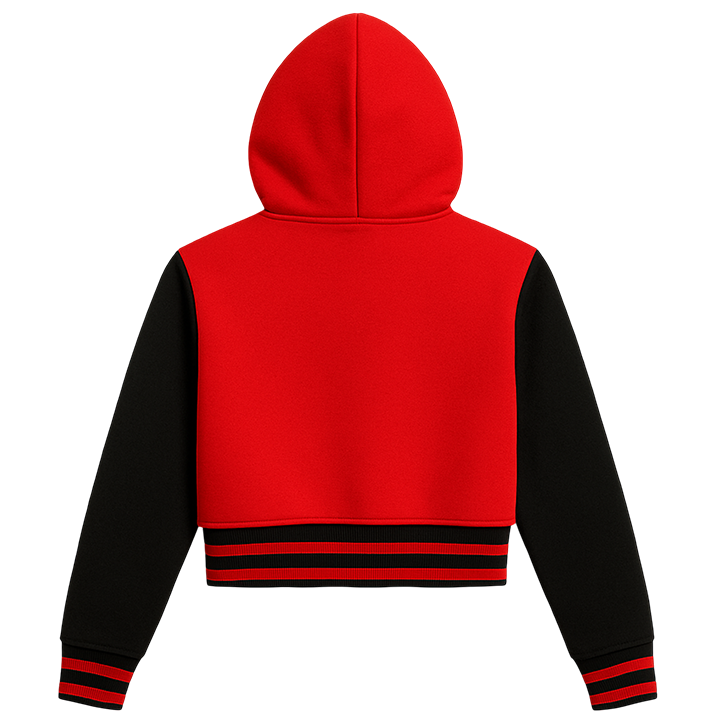 เสื้อแจ็คเก็ตฮู้ดดี้ทรงครอปสีแดงและดำสำหรับผู้หญิง ติดกระดุมแป๊กด้านหน้า ปักลายแบบกำหนดเอง สไตล์สตรีทแวร์