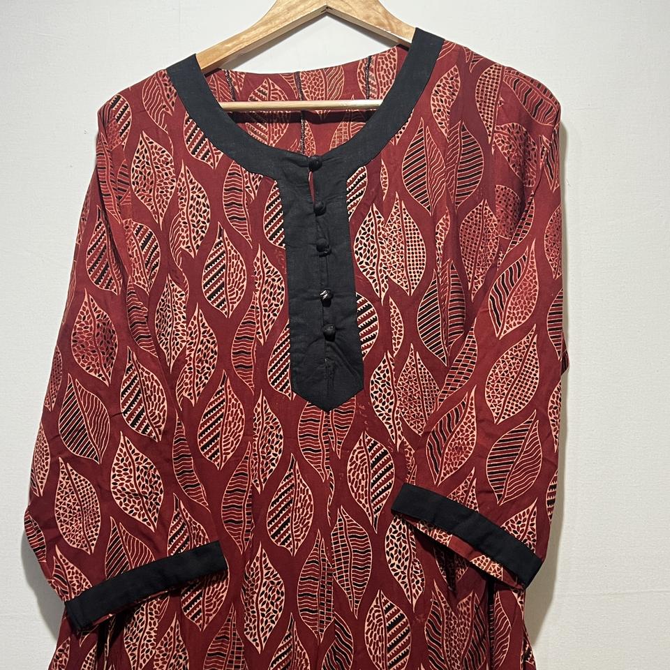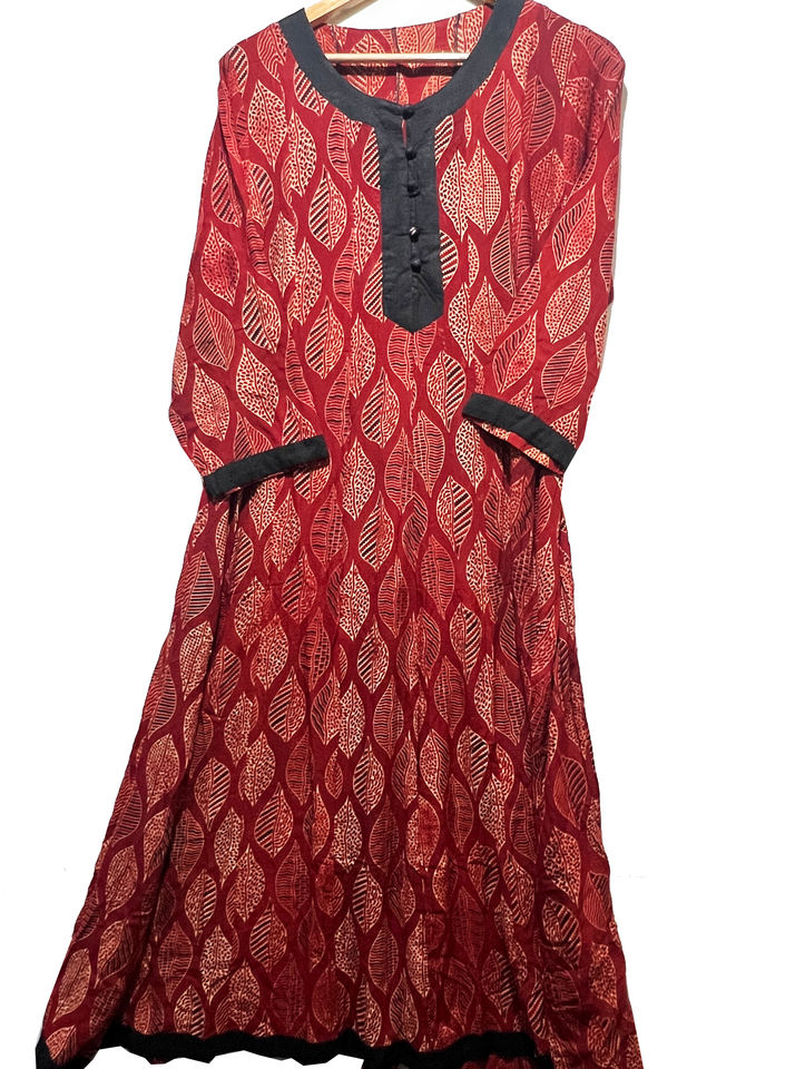 ชุดเดรสผ้าเรยอนสีแดงพิมพ์ลายดอกไม้สไตล์อาจรักห์ แบบรักษ์โลกสำหรับผู้หญิง แขนสามส่วน | ชุดคุร์ตีสไตล์เอไลน์แบบลำลองสำหรับชาวพื้นเมือง