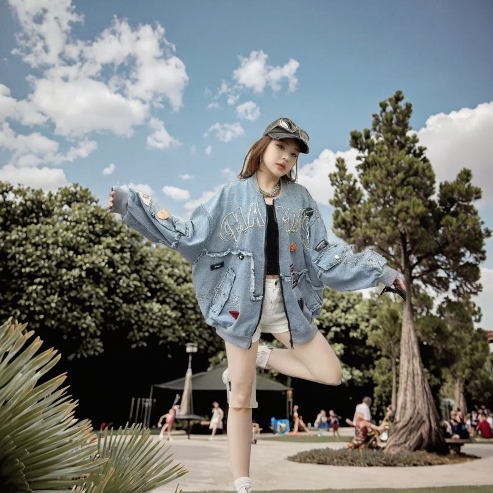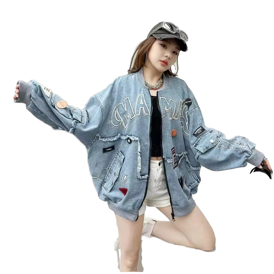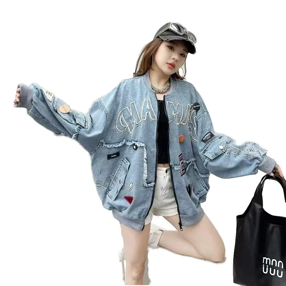 แจ็คเก็ตยีนส์ทรงปกติสำหรับผู้หญิง ลวดลายปักเก๋ ทรงหลวม สไตล์ไฮสตรีท ปรับแต่งได้สำหรับฤดูหนาว แจ็คเก็ตเบสบอลสุดยูนีค