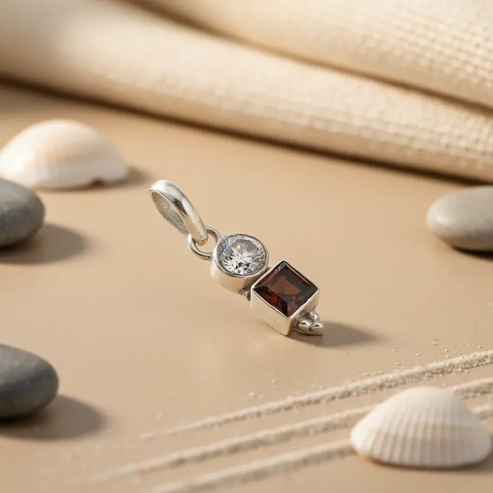 จี้พระเครื่องสำหรับผู้หญิง ทำจากเงินแท้ 925 ประดับด้วยเพชรคิวบิกเซอร์โคเนียและโกเมน ชุบทองคำขาวด้วยโรเดียม