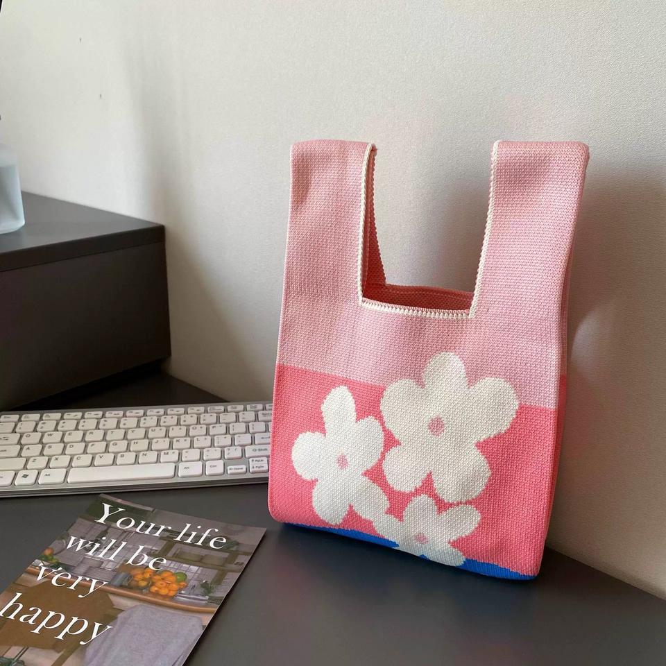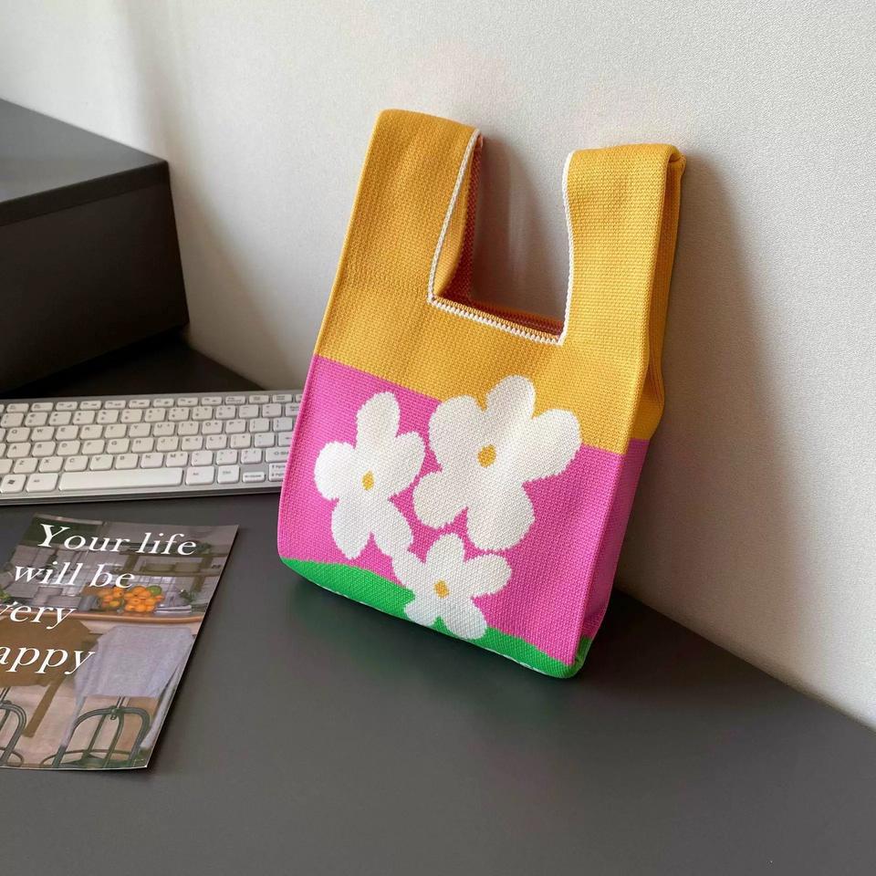 กระเป๋าผ้าโพลีเอสเตอร์ย้อนยุคสำหรับผู้หญิงกระเป๋าถักโครเชต์ขนาดใหญ่แบบเปิดปิดพร้อมกระเป๋าถือจัดระเบียบดอกไม้สำหรับถักงานฝีมือ
