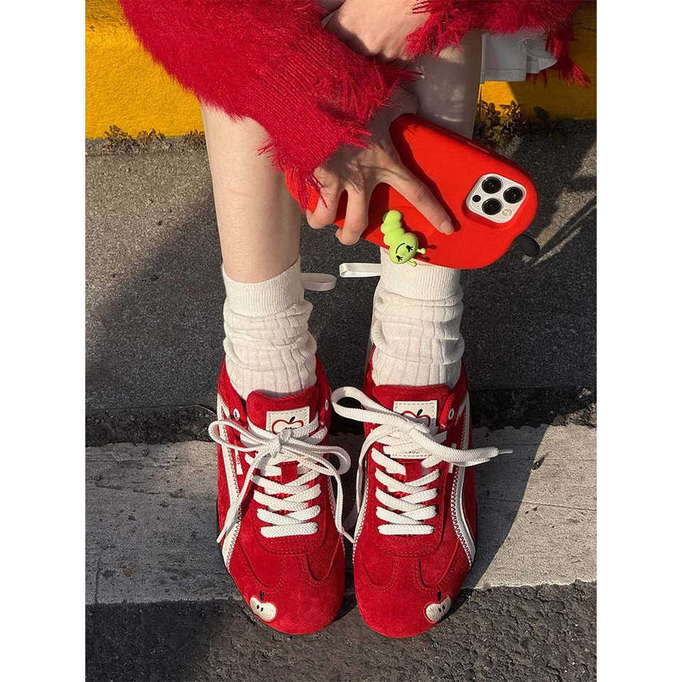 รองเท้าผ้าใบผู้หญิงสไตล์เรโทรสีแดงหนังวัวแท้ ดีไซน์สีสันตัดกัน ผูกเชือก สวมใส่สบาย เหมาะกับการเล่นกีฬา พื้นบาง ทันสมัย