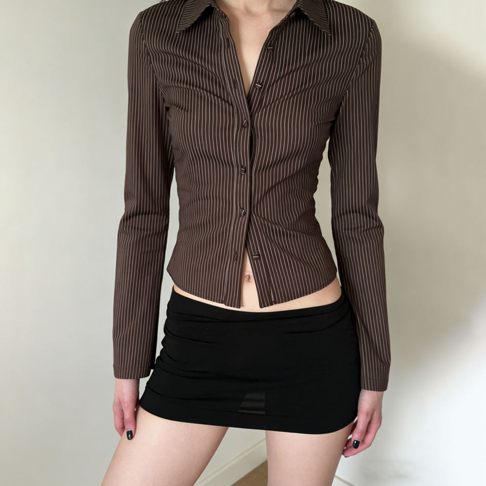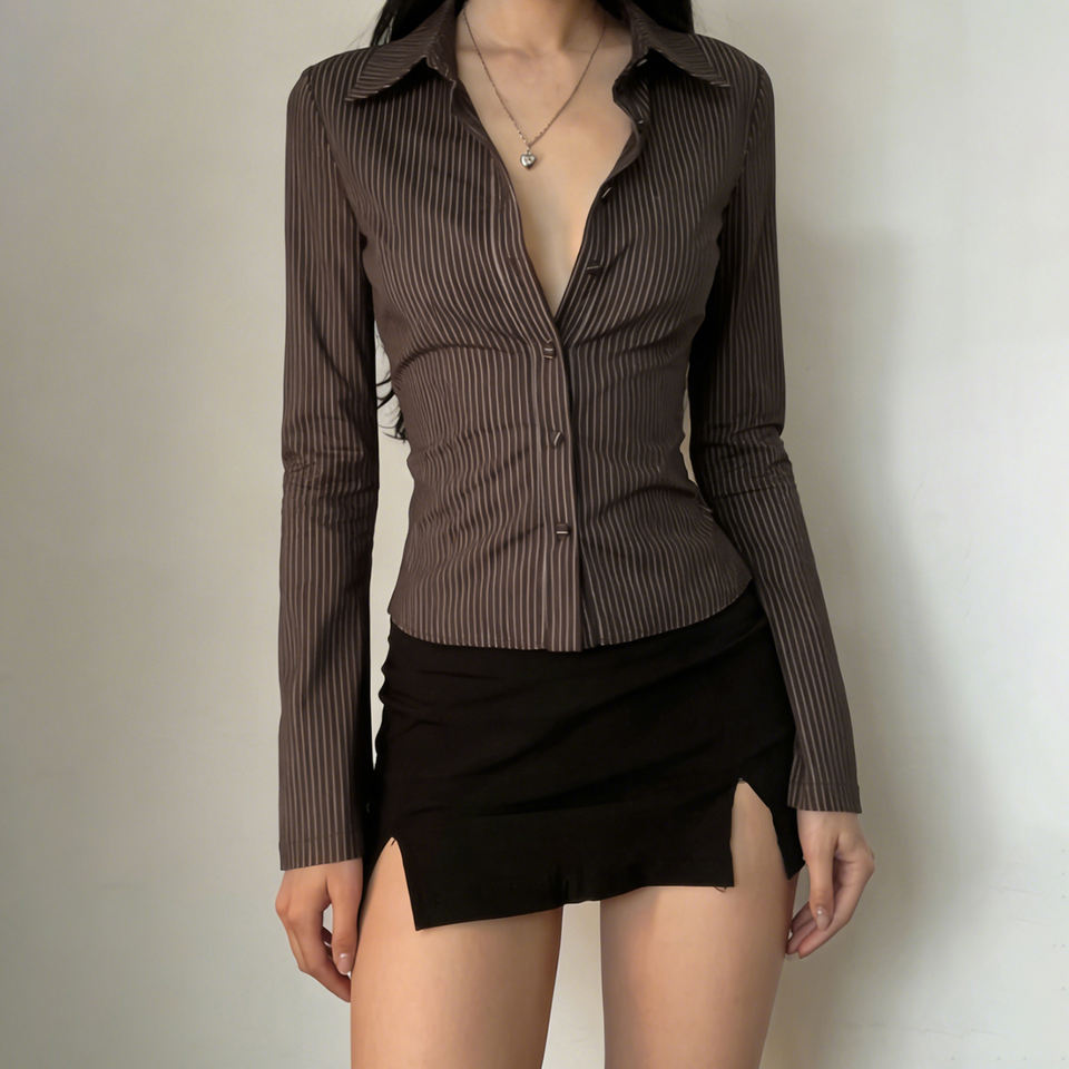 เสื้อเบลาส์ผู้หญิงสไตล์วินเทจลายทางสีน้ำตาล แขนยาว ทรงเข้ารูป ปกติดกระดุม ระบายอากาศได้ดี เป็นมิตรกับสิ่งแวดล้อม เหมาะสำหรับฤดูร้อน