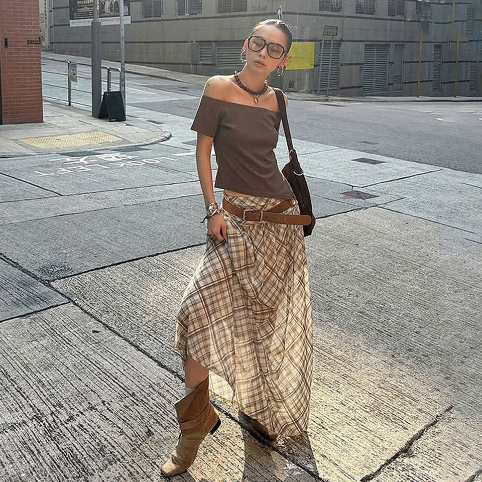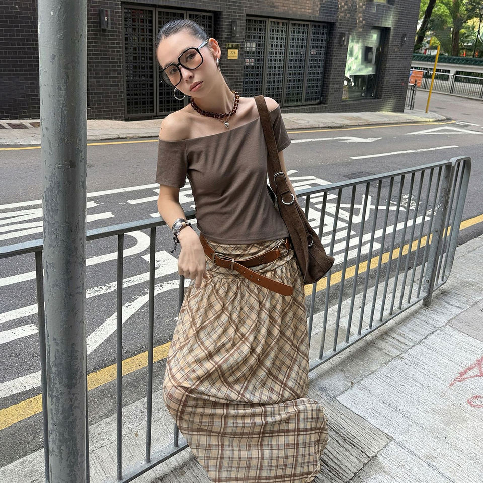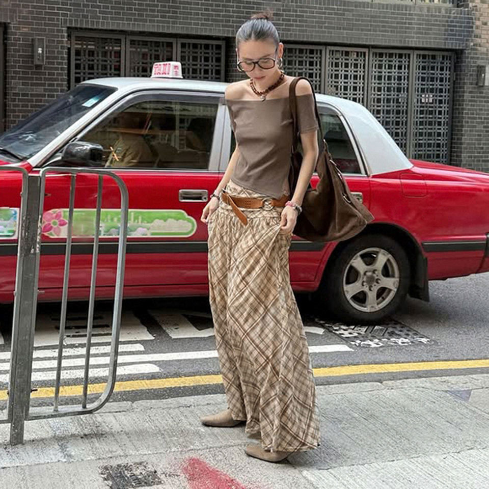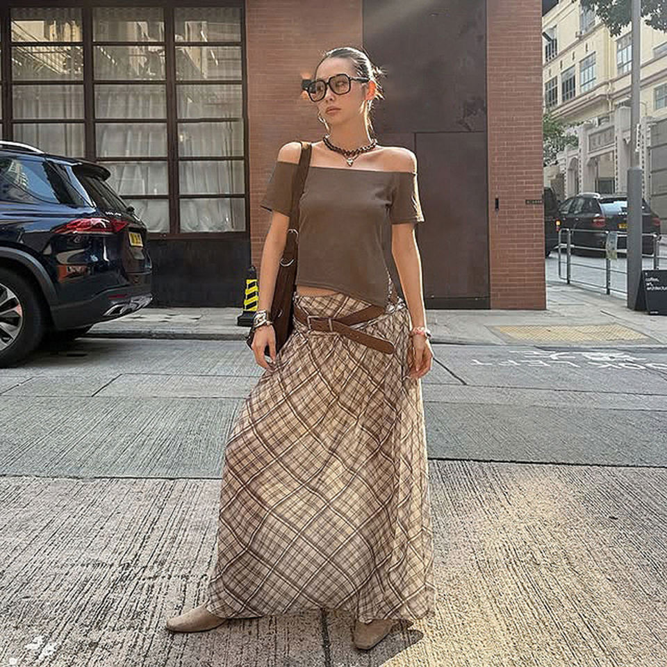 กระโปรงแม็กซี่ลายสก็อตสไตล์เรโทรสำหรับผู้หญิง เอวต่ำ แต่งสีตัดกัน ผ้าซีทรู หลายชั้น พลิ้วไหว ยาว เหมาะสำหรับแฟชั่นฤดูร้อน