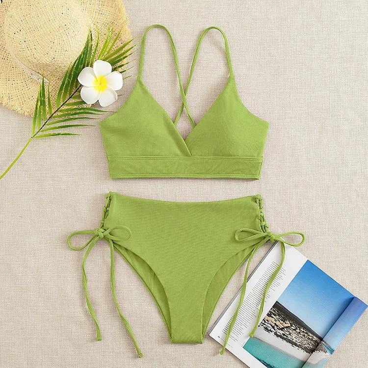 เซ็ตบิกินีสามเหลี่ยมแบบย้อนกลับได้เป็นมิตรต่อสิ่งแวดล้อมชุดว่ายน้ำผ่าข้างคอวีเซ็กซี่ชุดว่ายน้ำลูกไม้สีพื้นสำหรับขนาดใหญ่พิเศษ
