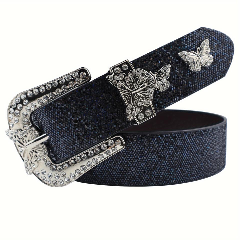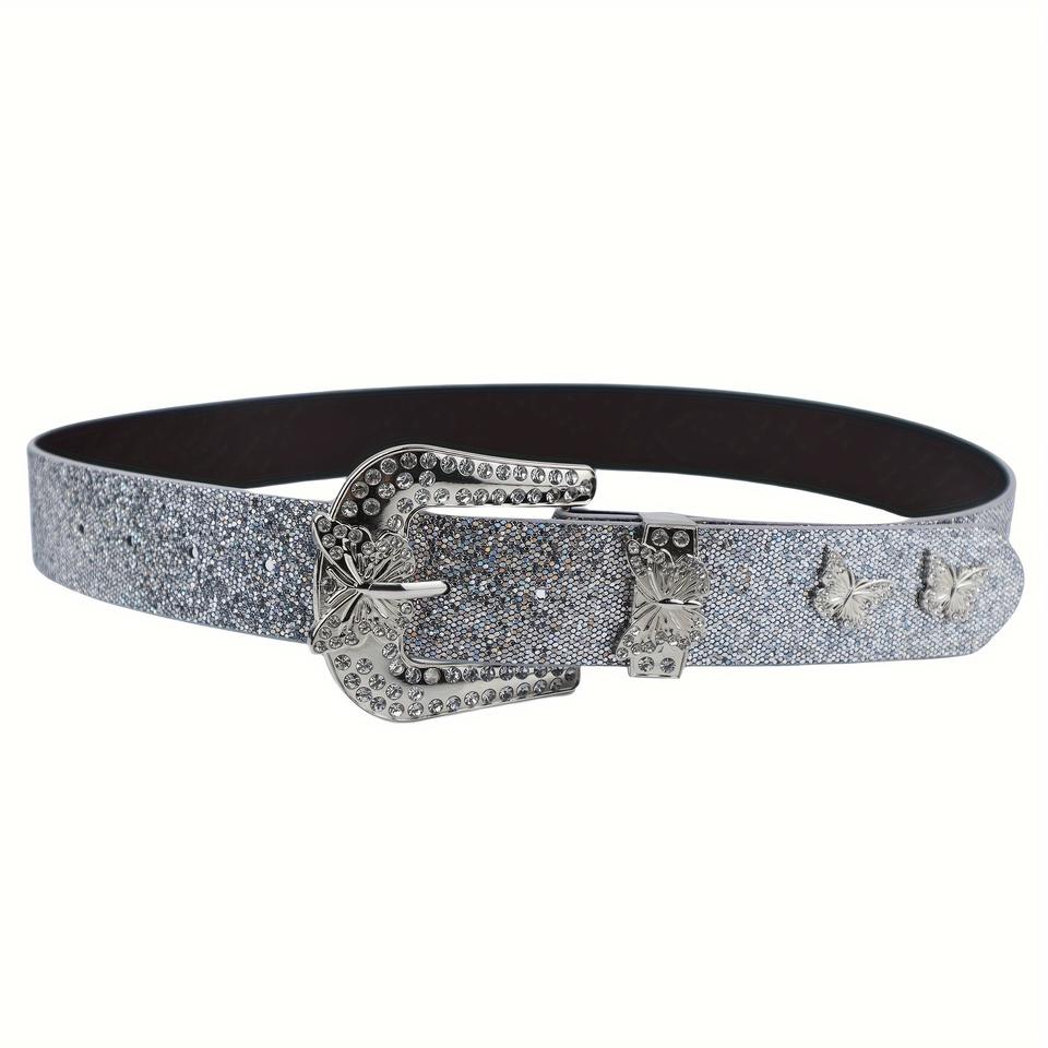 เข็มขัดผู้หญิงประดับเพชร สไตล์ตะวันตก ลำลอง ประดับคริสตัลวิบวับ หนัง PU หัวเข็มขัดโลหะผสมรูปตัว D ดีไซน์ไม่สมมาตร สำหรับใส่กับกางเกงยีนส์