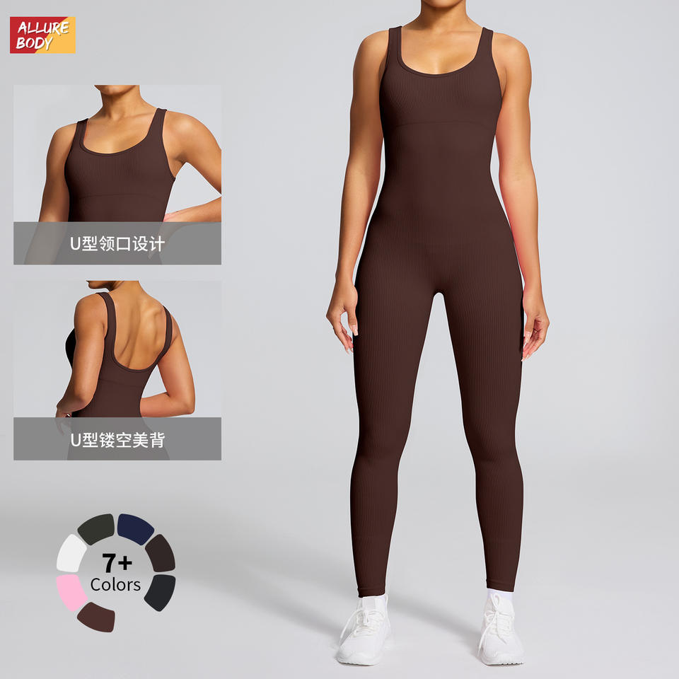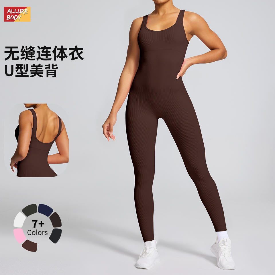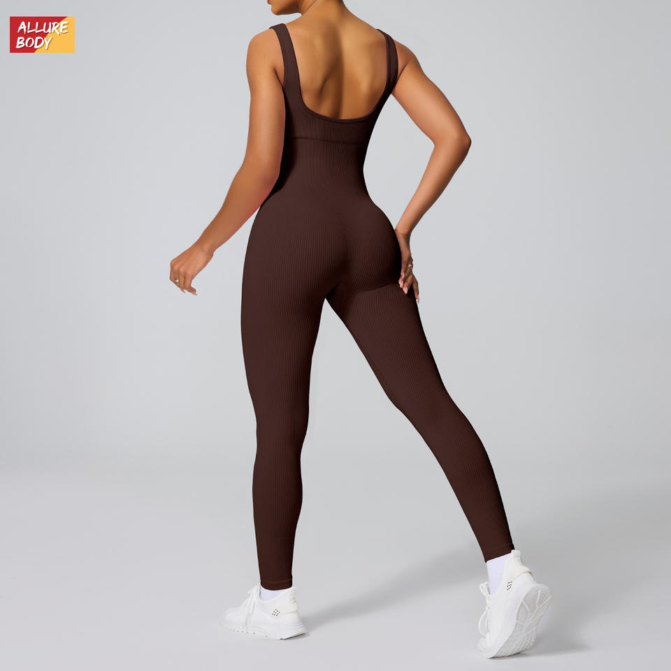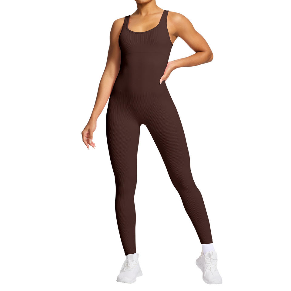 ชุดบอดี้สูทผู้หญิงแบบร่อง ไร้ตะเข็บ ยืดหยุ่นได้ ชุดกีฬา คอกว้าง กระชับรูปร่าง ชุดโยคะขายาว สีน้ำตาลเข้ม