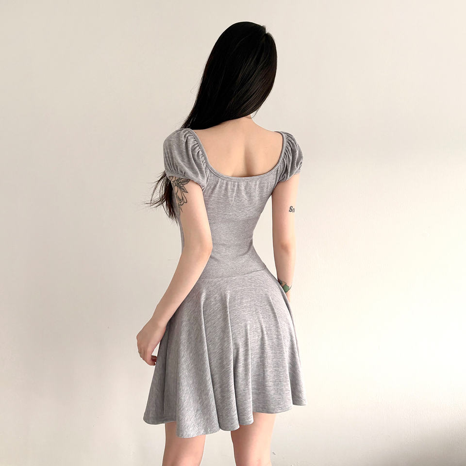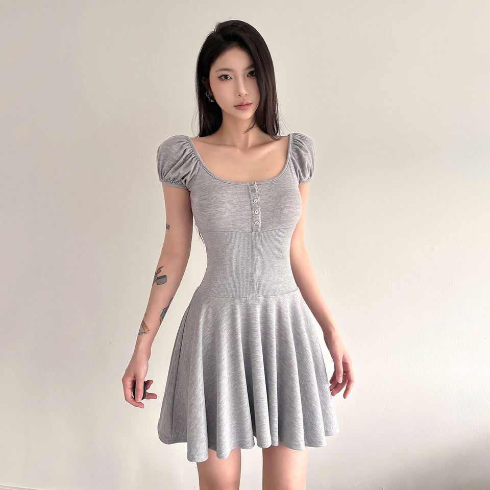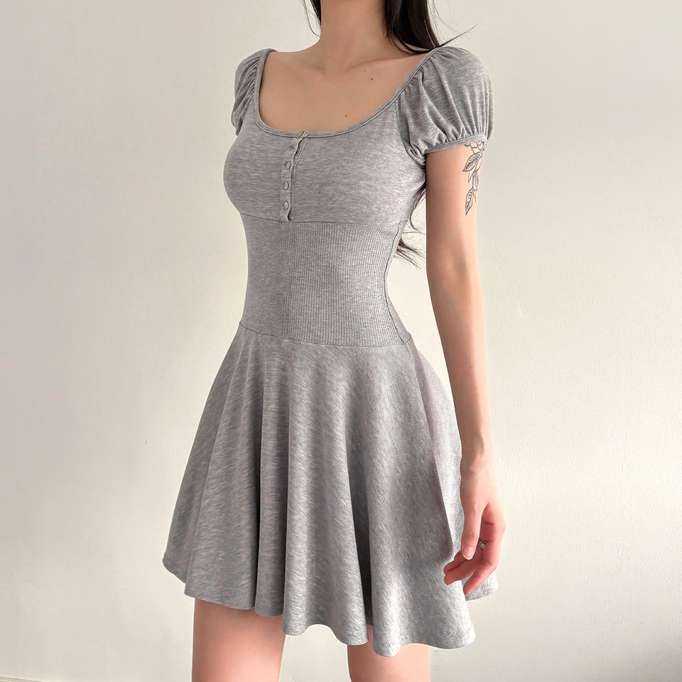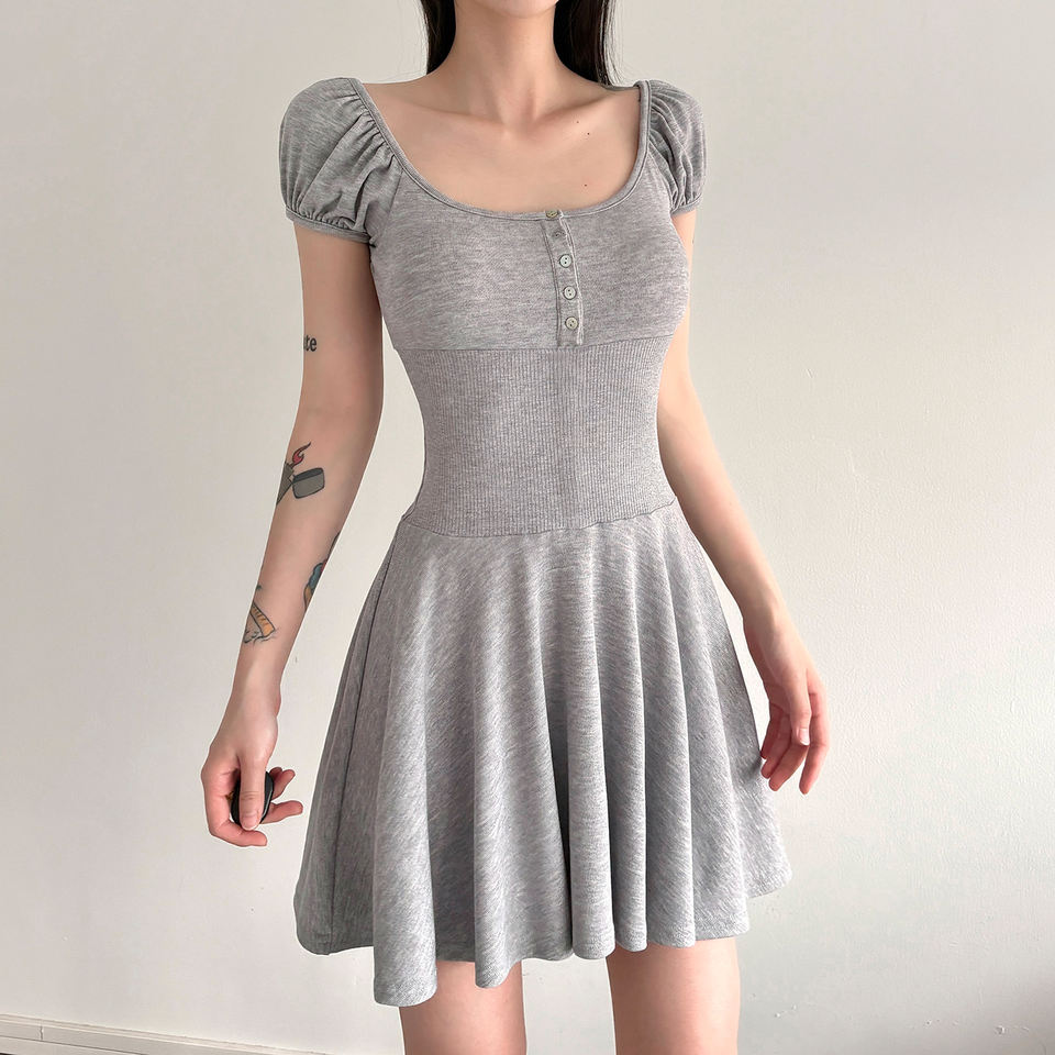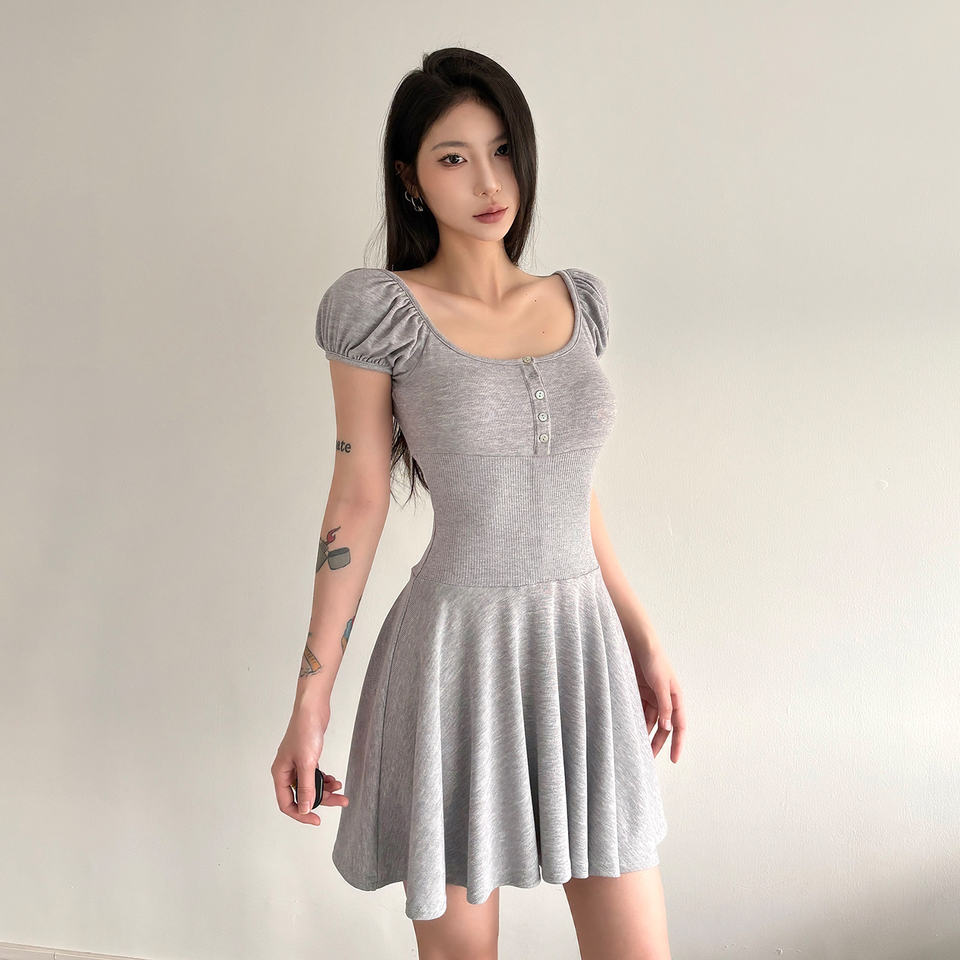 เดรสมินิเดรสสั้นทรงเอไลน์แขนพองถักแบบมีกระดุมเสื้อคอกลมทรงสลิมฟิตสำหรับผู้หญิง