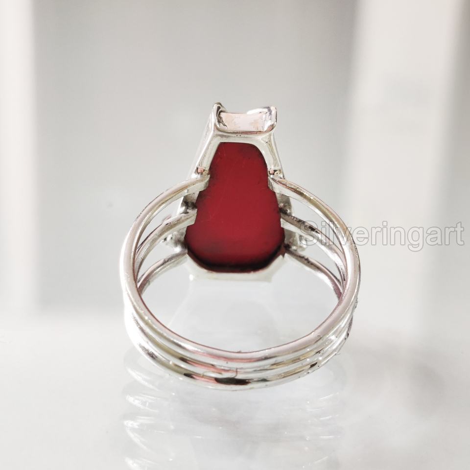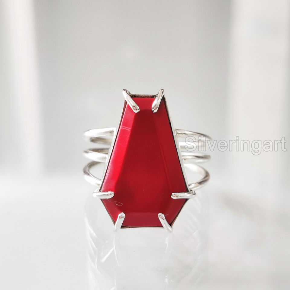 แหวนผู้หญิง แหวนเงินแท้ 925 ประดับพลอยปะการังแดงธรรมชาติเกรด AAA รูปทรงโลงศพ ของขวัญวันครบรอบแต่งงาน ประจำเดือนเมษายน ทำด้วยมือ