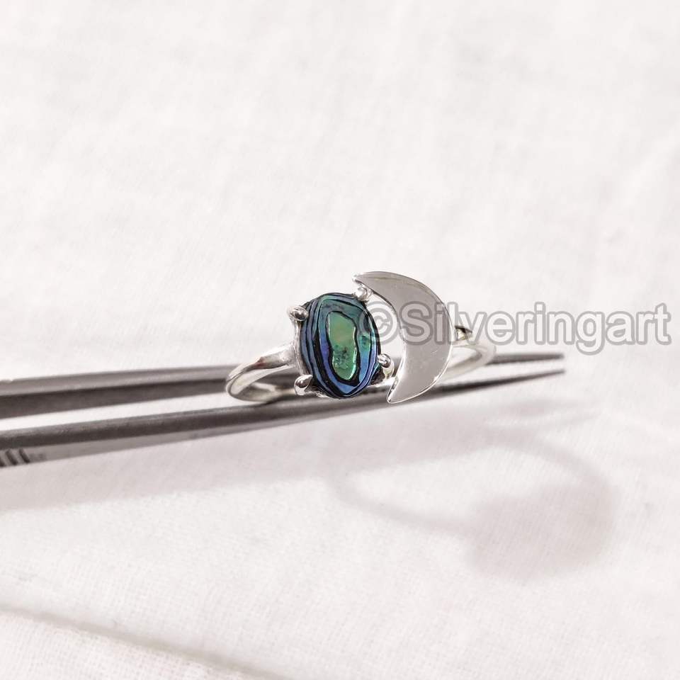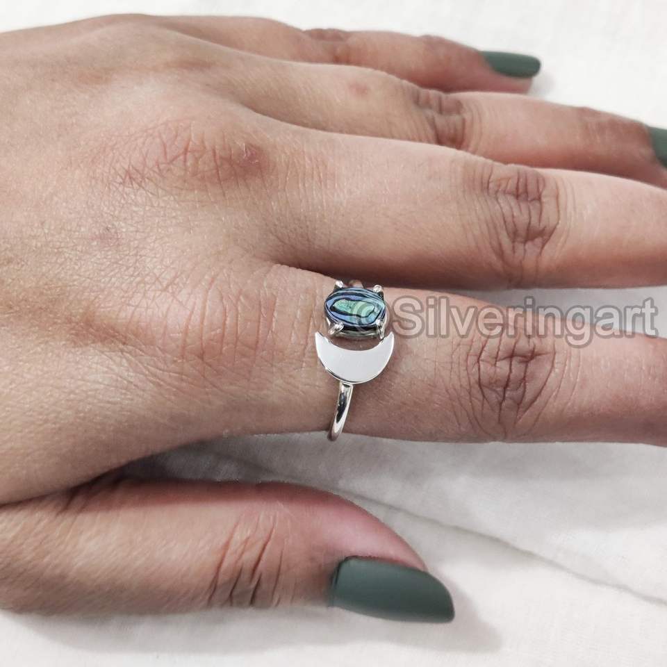 แหวนสตรีเปลือกหอยเป๋าฮื้อธรรมชาติอัญมณีเปลือกหอยอัญมณีหินวันเกิดจันทร์เสี้ยวเครื่องประดับแฮนด์เมด925แหวนเงินสเตอร์ลิง
