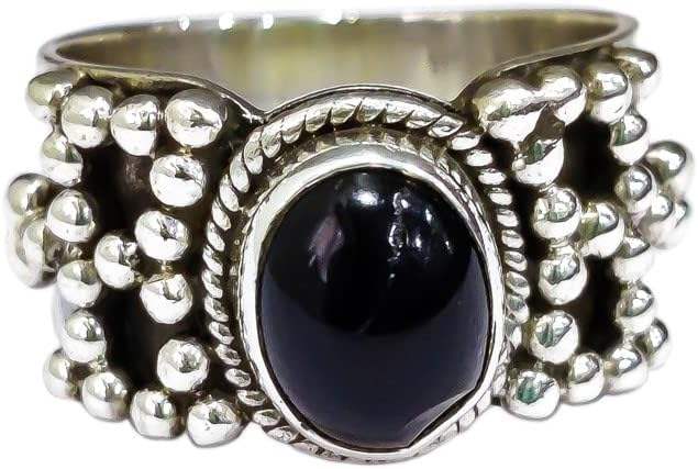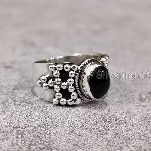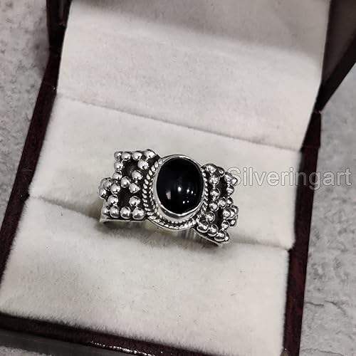 แหวนผู้หญิงพลอยออนิกซ์สีดำธรรมชาติ หินประจำเดือนธันวาคม ของขวัญคริสต์มาส เครื่องประดับทำมือสไตล์โบฮีเมียน แหวนเงินแท้ 925