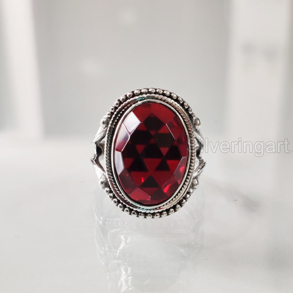 แหวนผู้หญิงลายตารางธรรมชาติโกเมนอัญมณี January birthary Stone Bohemian band แฮนด์เมดเครื่องประดับงานแต่งงานแหวนเงินสเตอร์ลิง925