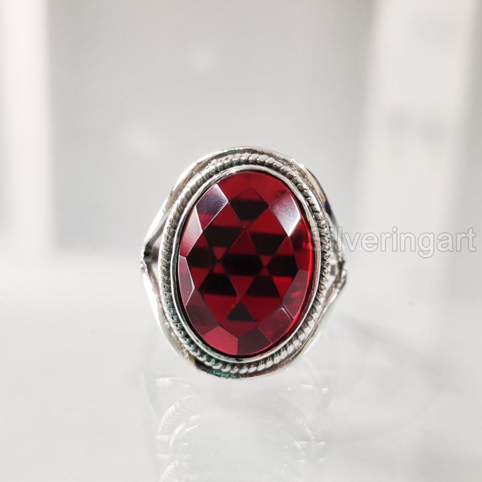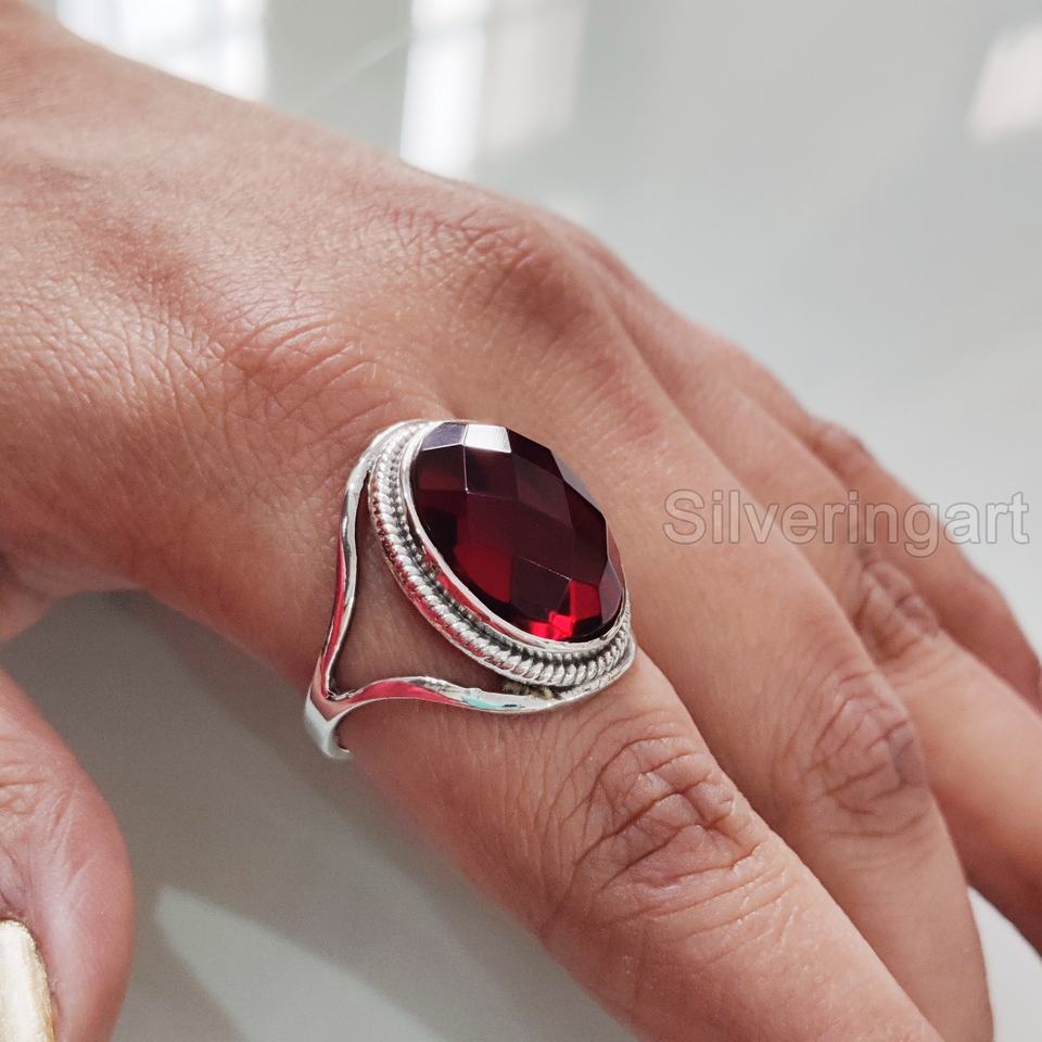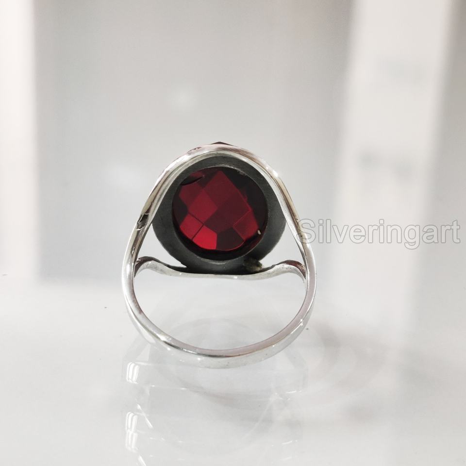 แหวนสำหรับผู้หญิงแหวนโกเมนลายตารางธรรมชาติพลอยโกเมน January birthary designer แฮนด์เมดตะวันออกเครื่องประดับ925แหวนเงินสเตอร์ลิง