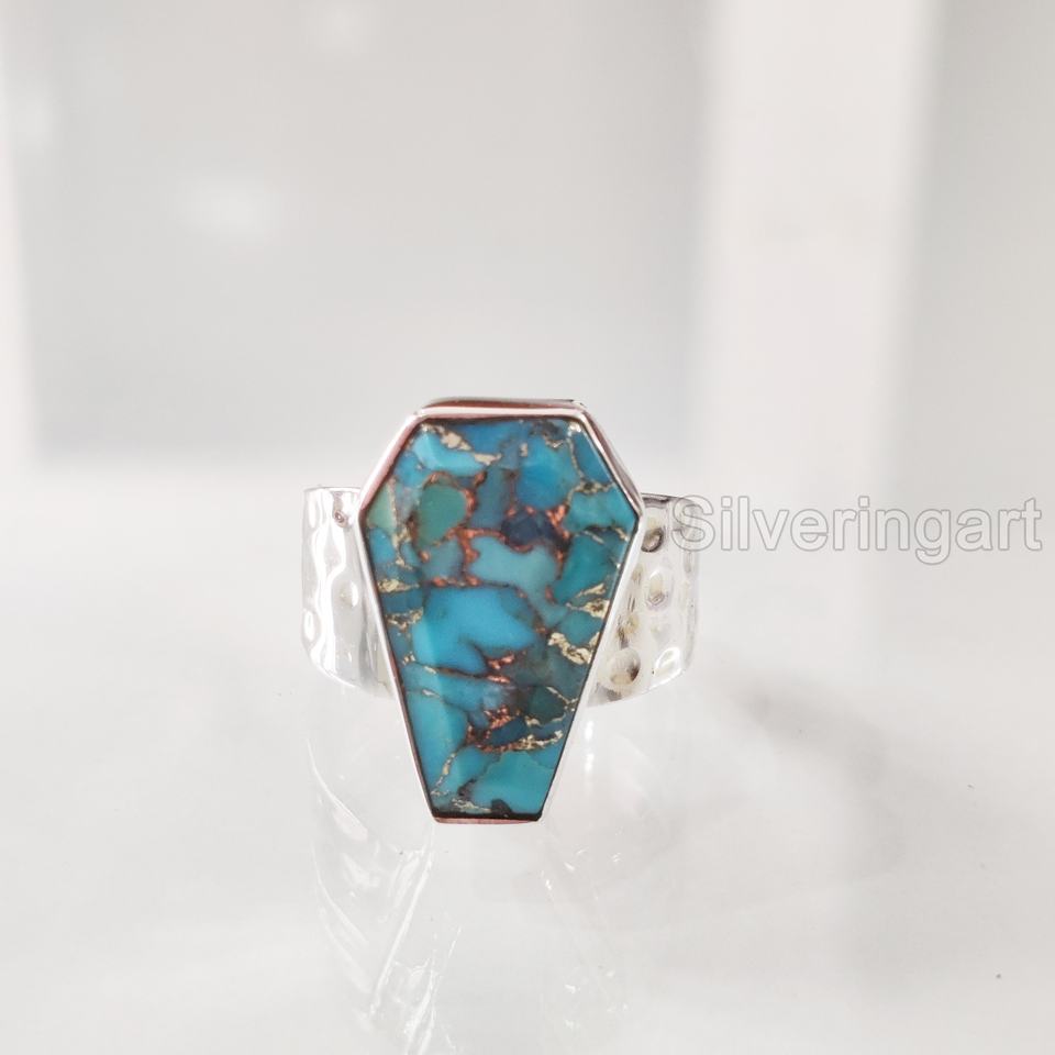 แหวนสตรีโลงศพธรรมชาติสีฟ้าทองแดงเทอร์ควอยส์พลอย December birthstone PARTY ค้อน unisex แหวนเงินสเตอร์ลิง925