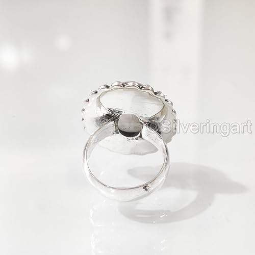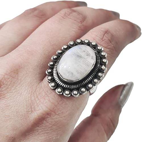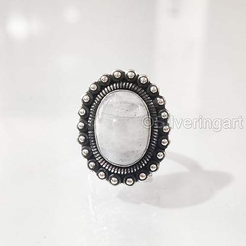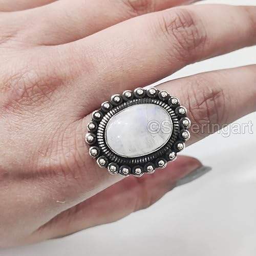 แหวนผู้หญิงพลอยมูนสโตนสีรุ้งธรรมชาติ หินประจำเดือนมิถุนายน ของขวัญคริสต์มาส แหวนเงินแท้ 925 ทำมือสไตล์โบราณขนาดใหญ่