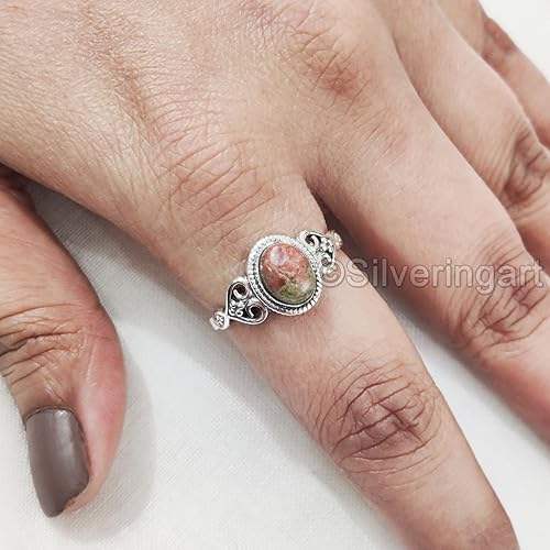 แหวนผู้หญิง หินธรรมชาติ ยูนาไคต์ แจสเปอร์ แหวนดีไซน์เนอร์สไตล์โบฮีเมียน แหวนทำมือสำหรับคริสต์มาส เครื่องประดับเงินแท้ 925