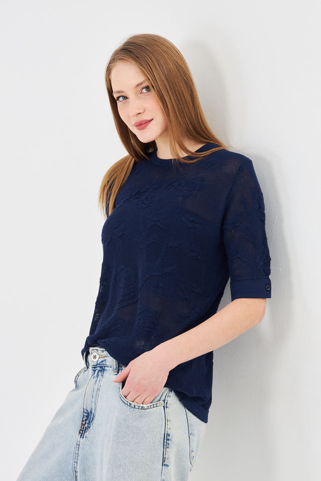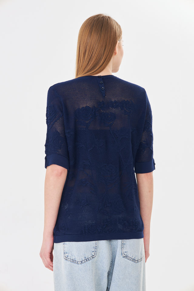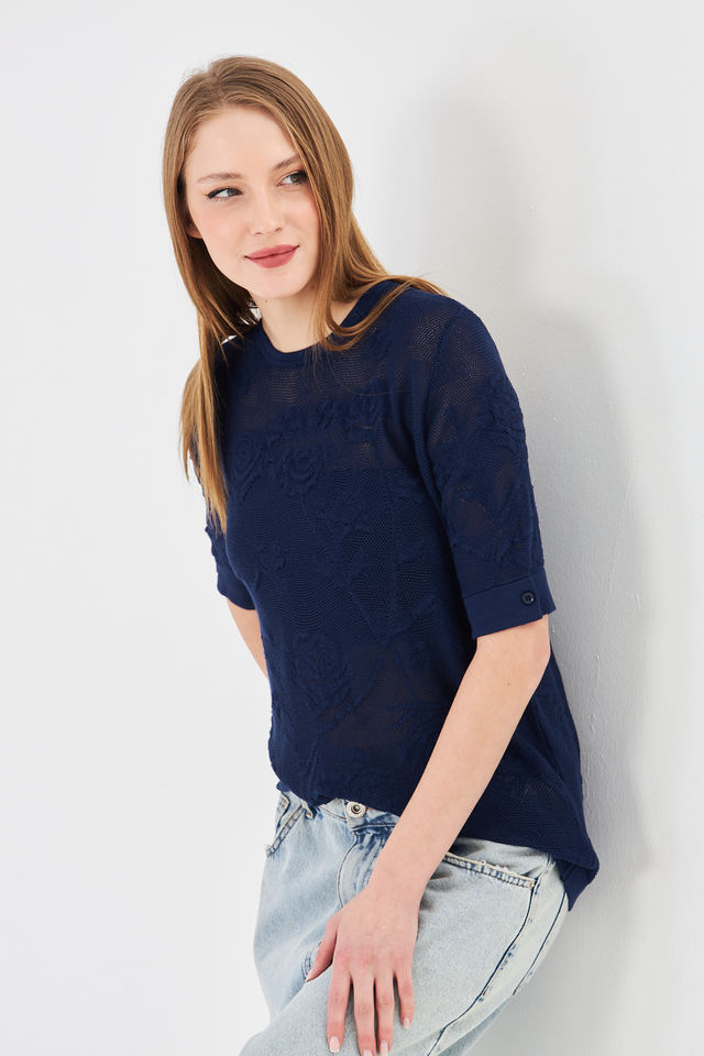 เสื้อถักลูกไม้ลายดอกกุหลาบสำหรับผู้หญิง - เสื้อคอกลมแขนสั้นเนื้อนุ่มพร้อมกระดุมด้านหลัง - เสื้อถักโครเชต์ลายดอกไม้สำหรับฤดูร้อน