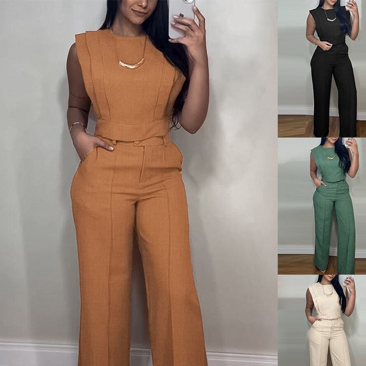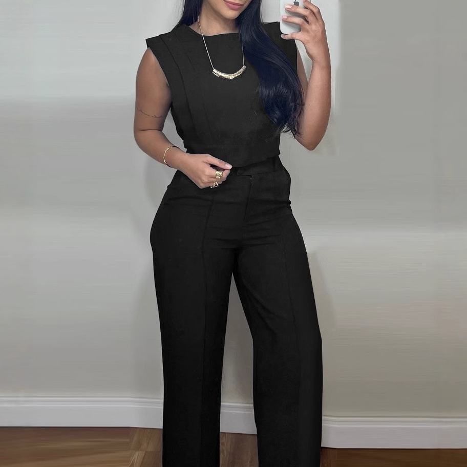 เสื้อคอกลมแขนสั้นผู้หญิงและกางเกงขาตรงชุดลำลอง 2 ชิ้นแฟชั่น