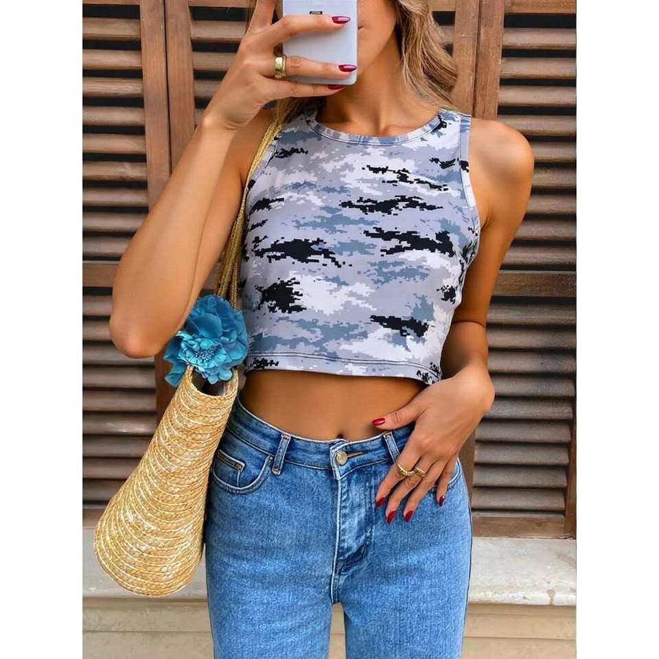เสื้อกล้ามคอกลมสำหรับผู้หญิงเสื้อครอปเอวลอยลำลองสำหรับฤดูร้อนระบายอากาศผ้าถักยืดสำหรับใช้ในชีวิตประจำวันและใช้ในยิม