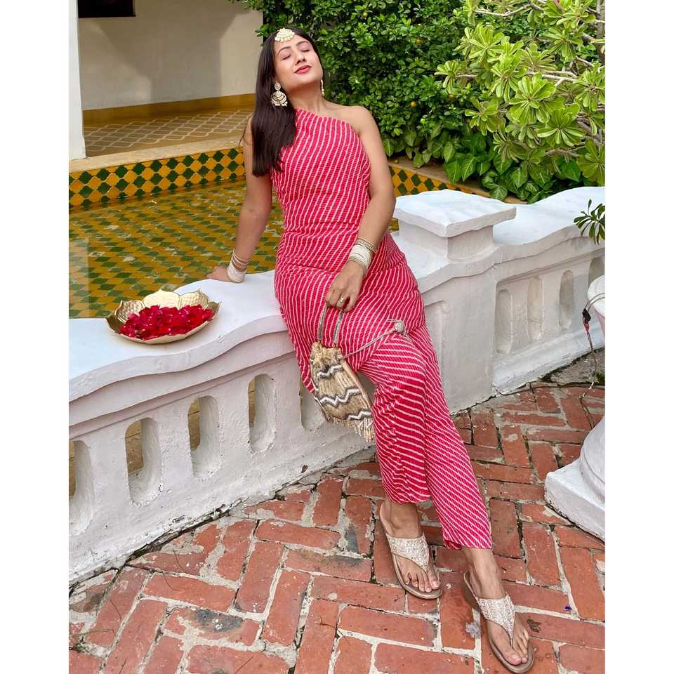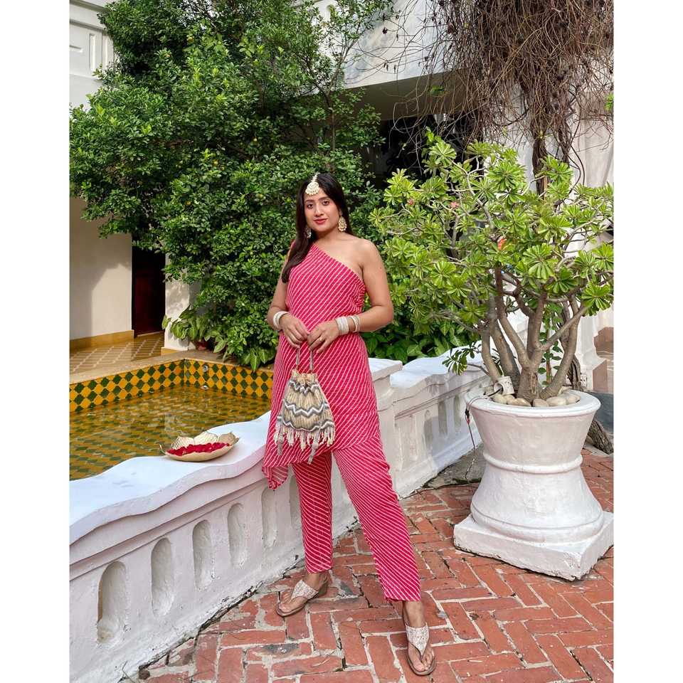 ชุดเซ็ตสูทผ้าเครปสีแดงแบบสั้น-ยาว แบรนด์ Samara รุ่น Leheriya สำหรับผู้หญิง ดีไซน์เนอร์ออกแบบ ชุดออกงานสไตล์ชาติพันธุ์ ระบายอากาศได้ดี