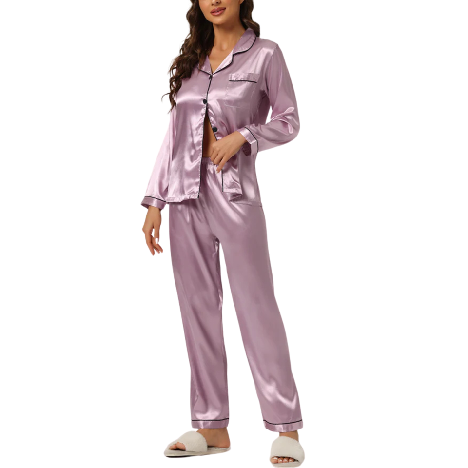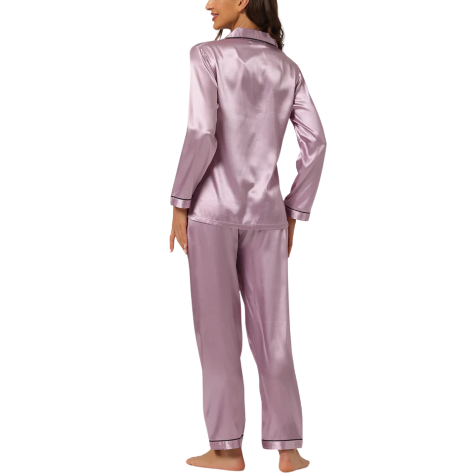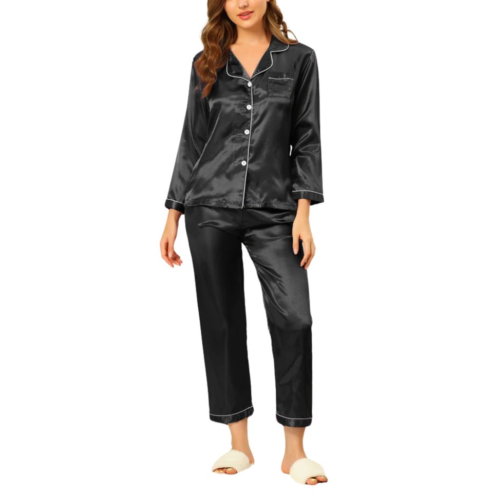 ชุดนอนผ้าซาตินระบายอากาศมีกระดุมสำหรับผู้หญิงชุดนอนผ้าซาตินนุ่มมีลายพื้นสำหรับฤดูร้อนฤดูใบไม้ร่วงและฤดูใบไม้ผลิ