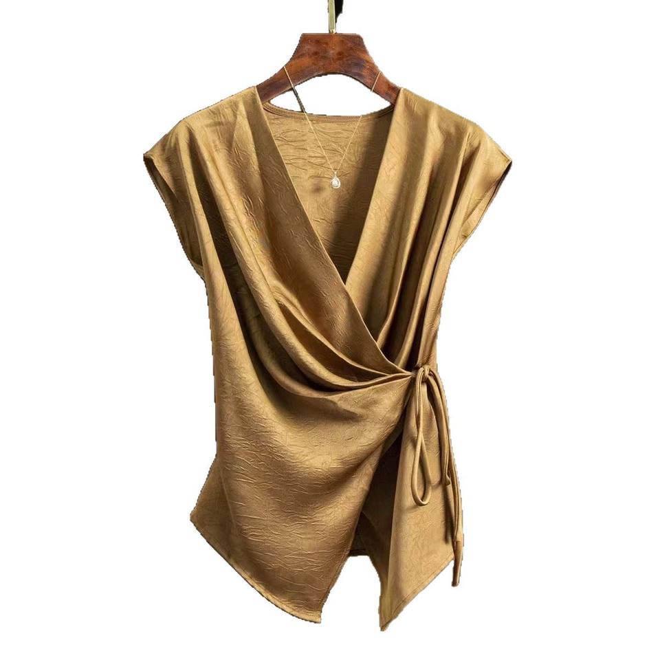 เสื้อเชิ้ตผ้าซาตินแบบผูกเอวสำหรับผู้หญิง คอวี แขนกุด สไตล์ลำลอง แฟชั่น