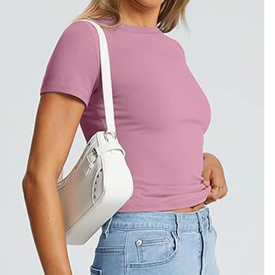 เสื้อยืดคอกลมแขนสั้นมีซับในสำหรับผู้หญิง เสื้อยืดครอปพื้นฐานสำหรับผู้หญิง เสื้อยืดคอกลมแขนสั้นผ้าถักยืด