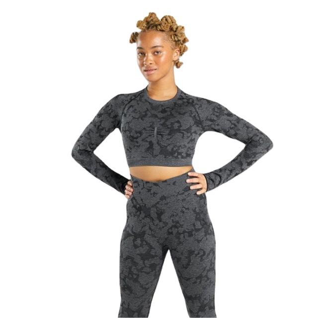 ชุดออกกำลังกายลายพรางไร้รอยต่อของผู้หญิงพร้อมเสื้อครอปแขนยาวและเลกกิ้งเอวสูงชุดออกกำลังกายเล่นยิมโยคะ