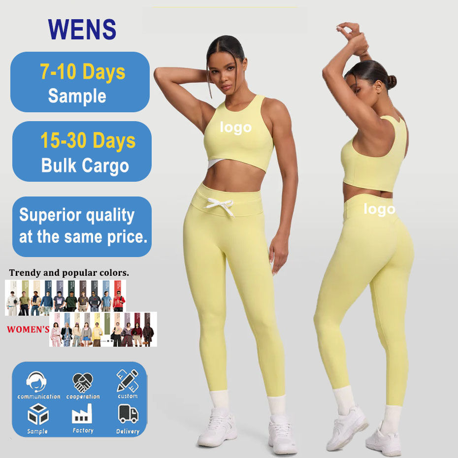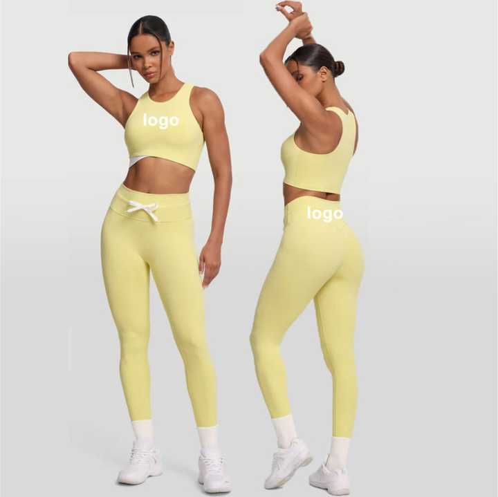 ชุดโยคะไร้รอยต่อสีเหลืองอ่อนของผู้หญิงเลกกิ้งเอวสูงพร้อมผ้านิ่มเนยชุดออกกำลังกาย2ชิ้น OEM ผู้ผลิต