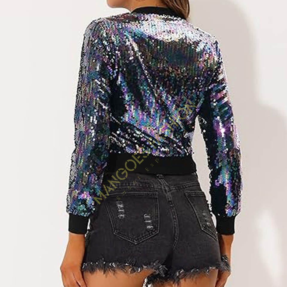 เสื้อแจ็คเก็ตผู้หญิงแฟชั่น Mangoes ประดับเลื่อมสีดำสำหรับฤดูหนาว แขนยาว สไตล์บอมเบอร์สำหรับงานปาร์ตี้ พร้อมหมวกถอดได้และซับในผ้าไหม