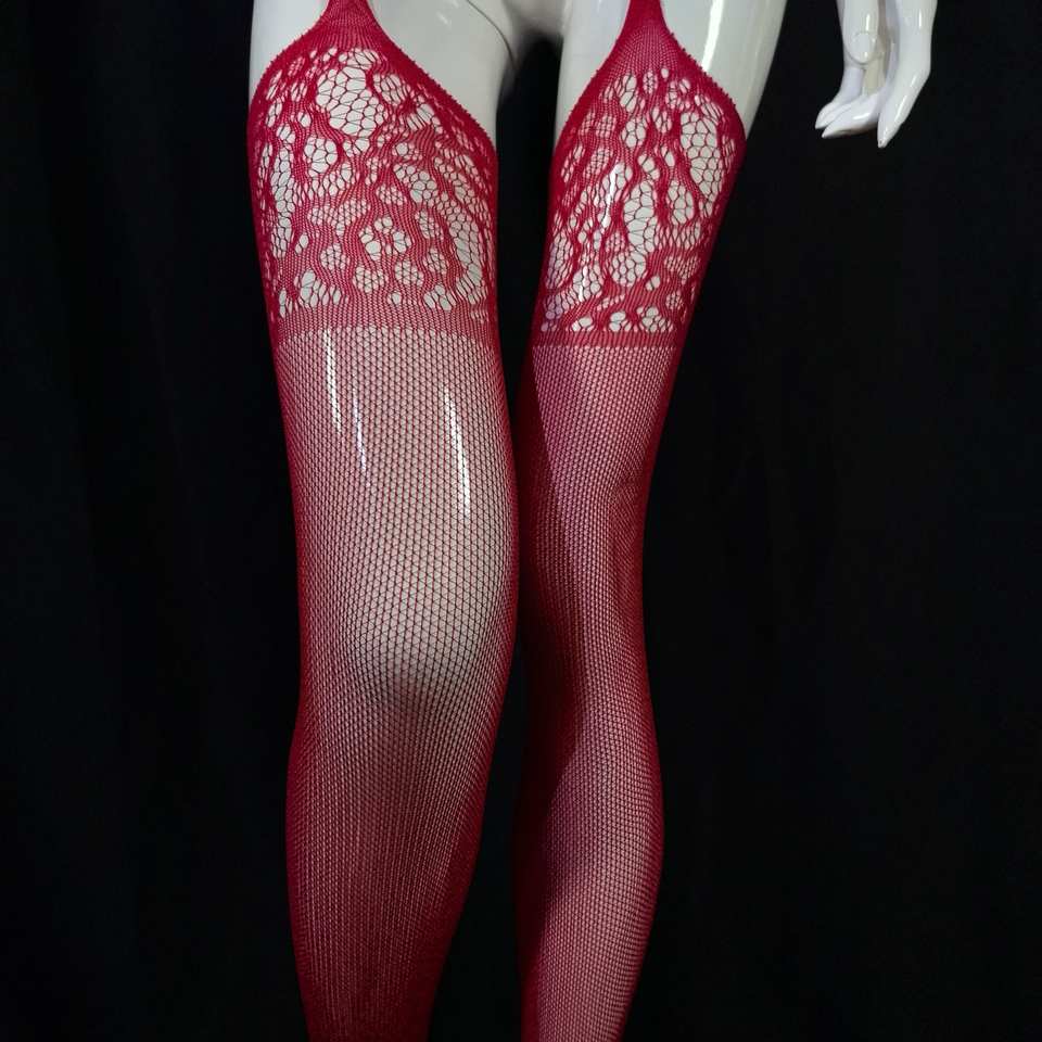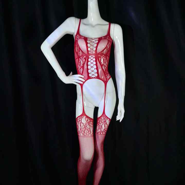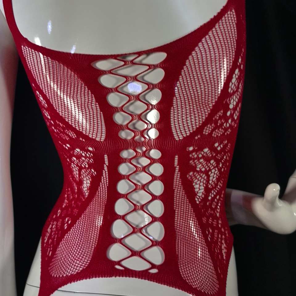 ชุดบอดี้สูทตาข่ายเซ็กซี่สำหรับผู้หญิง สีแดงร้อนแรง เป้าเปิด โชว์หลัง ประดับคริสตัล ดีไซน์โปร่งบาง ฟรีไซส์