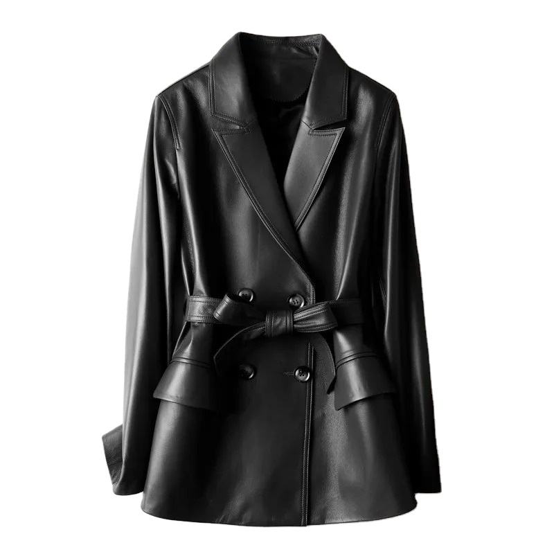 แจ็คเก็ตหนังแกะสำหรับผู้หญิง, เสื้อโค้ทหนังแท้ยาวปานกลางเอวเข้ารูปฤดูใบไม้ผลิและฤดูใบไม้ร่วง