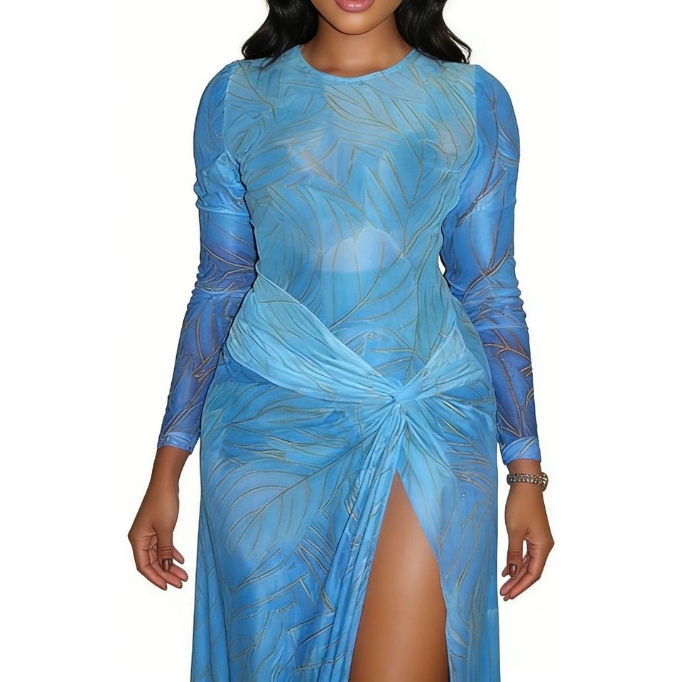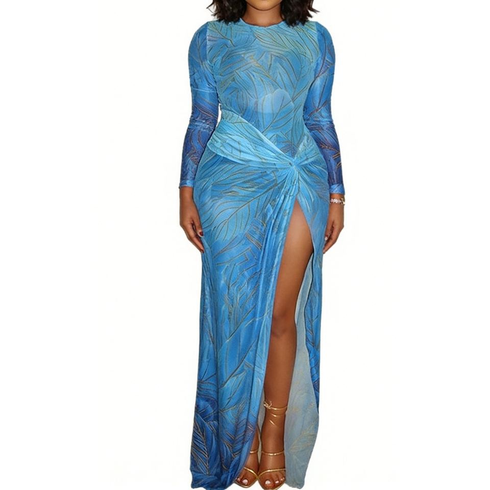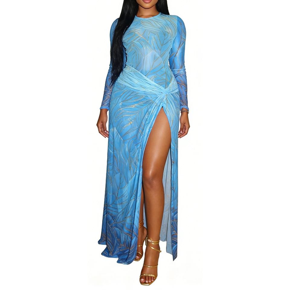 เดรสยาวพิมพ์ลายใบไม้ซีทรูสำหรับผู้หญิง แขนยาว ช่วงเอวเข้ารูป ผ่าสูง เหมาะสำหรับงานกลางคืน แฟชั่นชุดเดรส