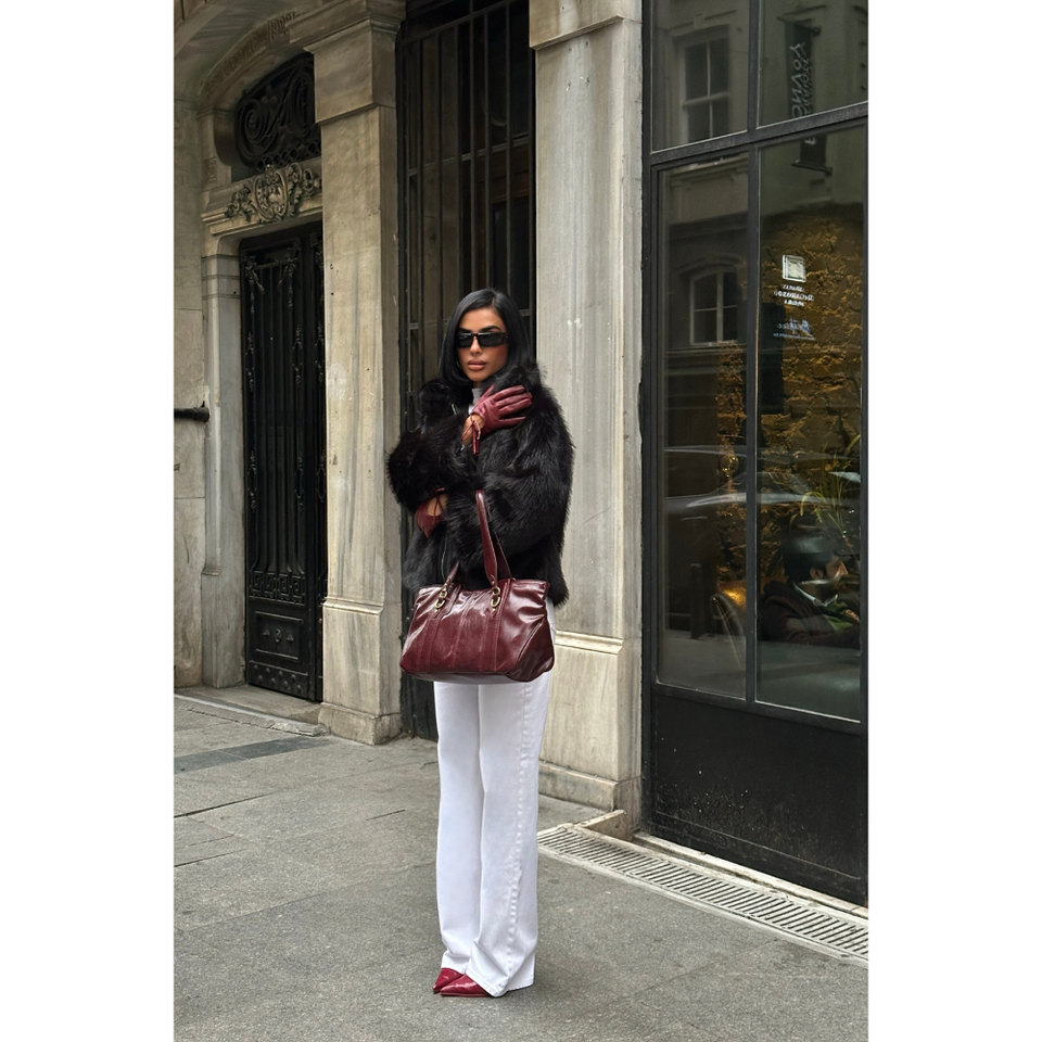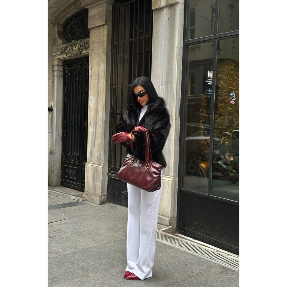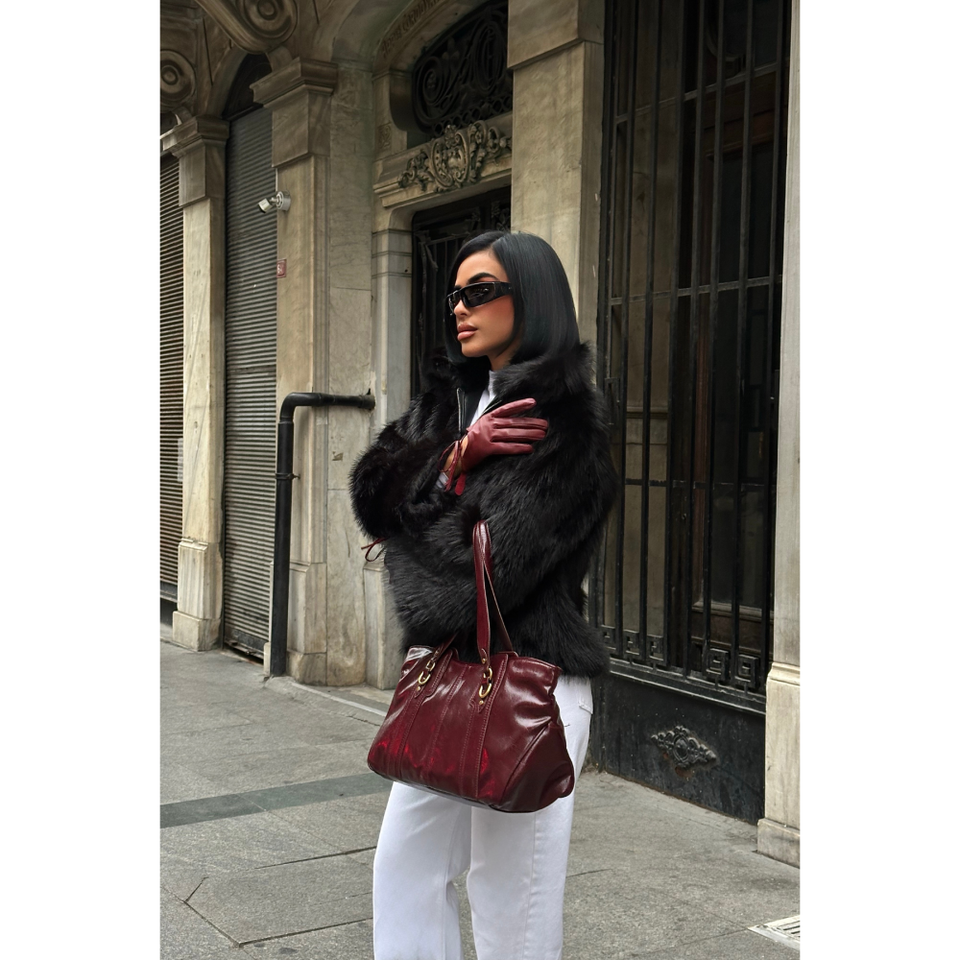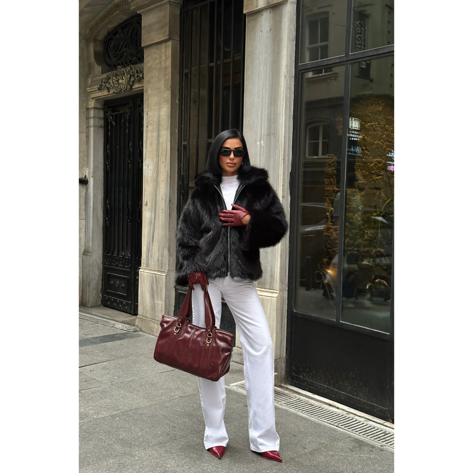 เสื้อโค้ทขนสัตว์เทียมสีดำแบบสั้นสำหรับผู้หญิง