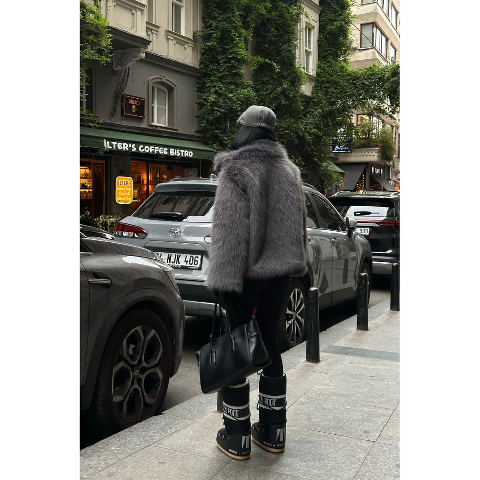 เสื้อโค้ทขนเฟอร์เทียมสีเทาแบบสั้นสำหรับผู้หญิง