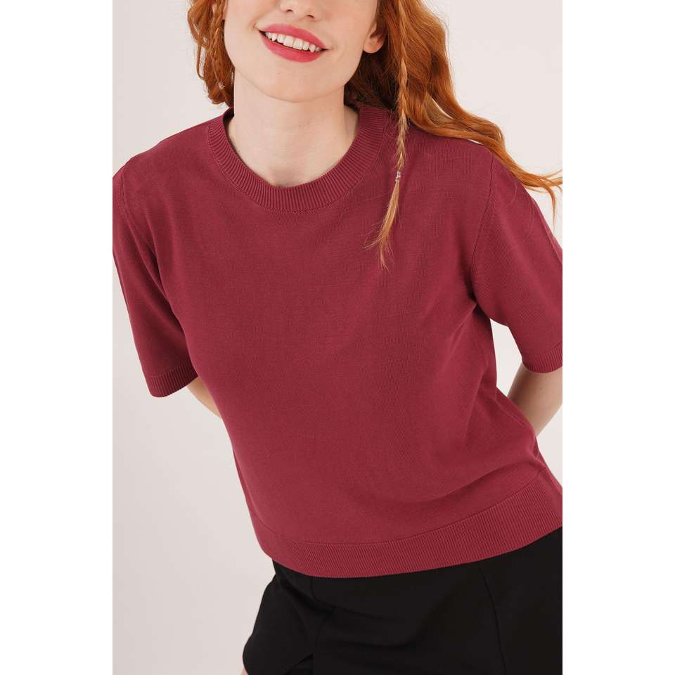 เสื้อถักแขนสั้นคอกลมผ้าไลคร่าสีแดงเบอร์กันดีบางเบาสำหรับผู้หญิง ขายส่ง