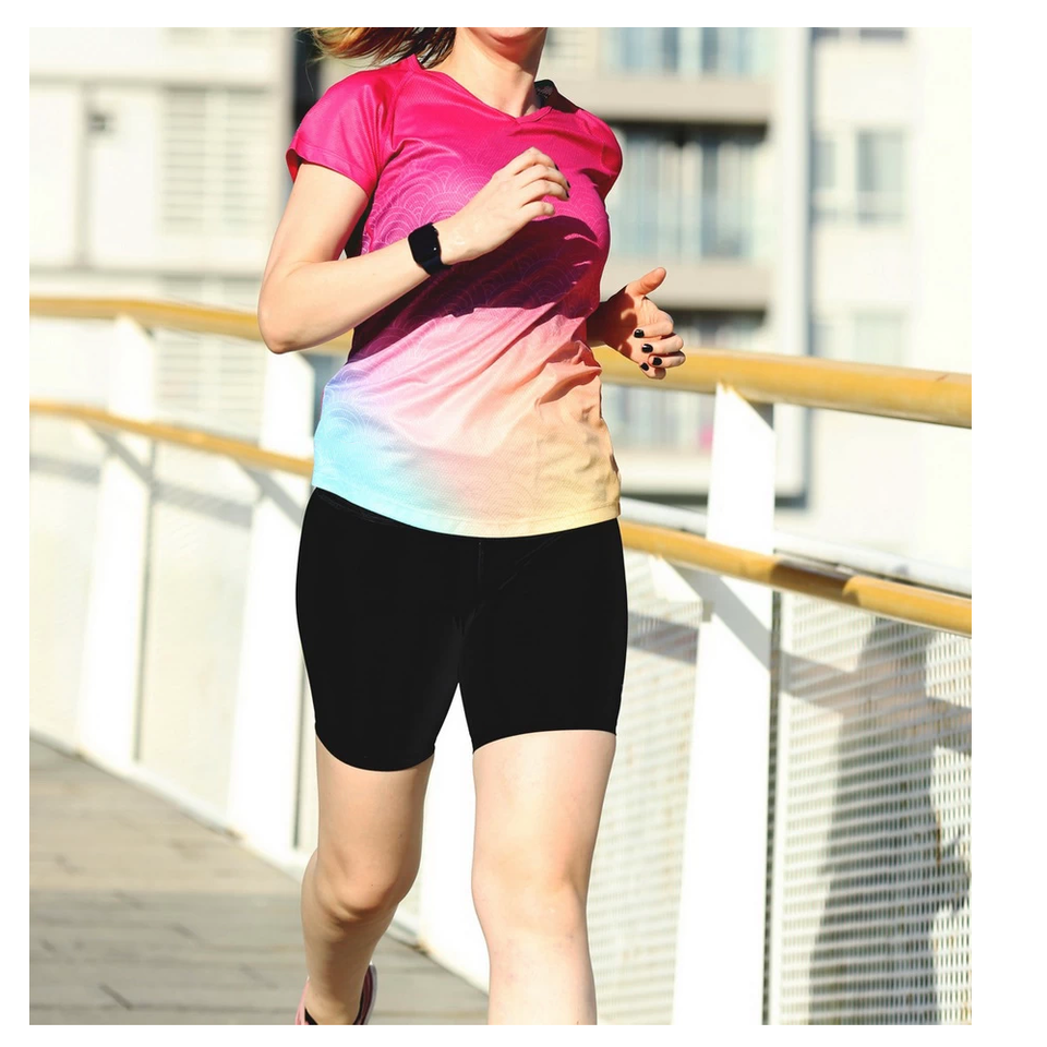 เสื้อกีฬาโยคะแขนสั้นของผู้หญิงเข้ารูประบายอากาศได้ดีใส่เล่นฟิตเนสวิ่งลำลองดีไซน์ซับลิเมชันทำจากผ้าตาข่าย