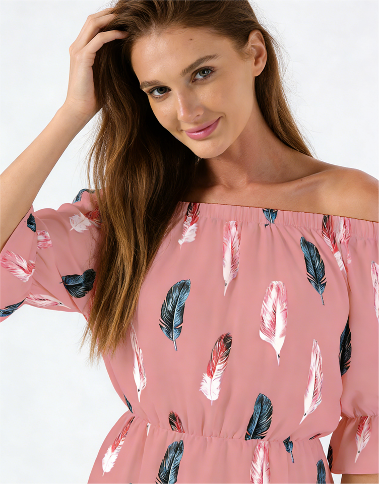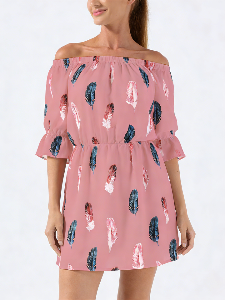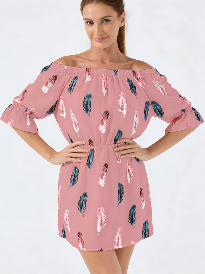 เดรสทรงเอพิมพ์ลายขนนกสำหรับผู้หญิง ความยาวระดับเข่า แขนบาน เอวยางยืด ทรงลำลอง ใส่ได้ทุกวัน เหมาะสำหรับใส่ไปเที่ยวทะเลในช่วงฤดูร้อน