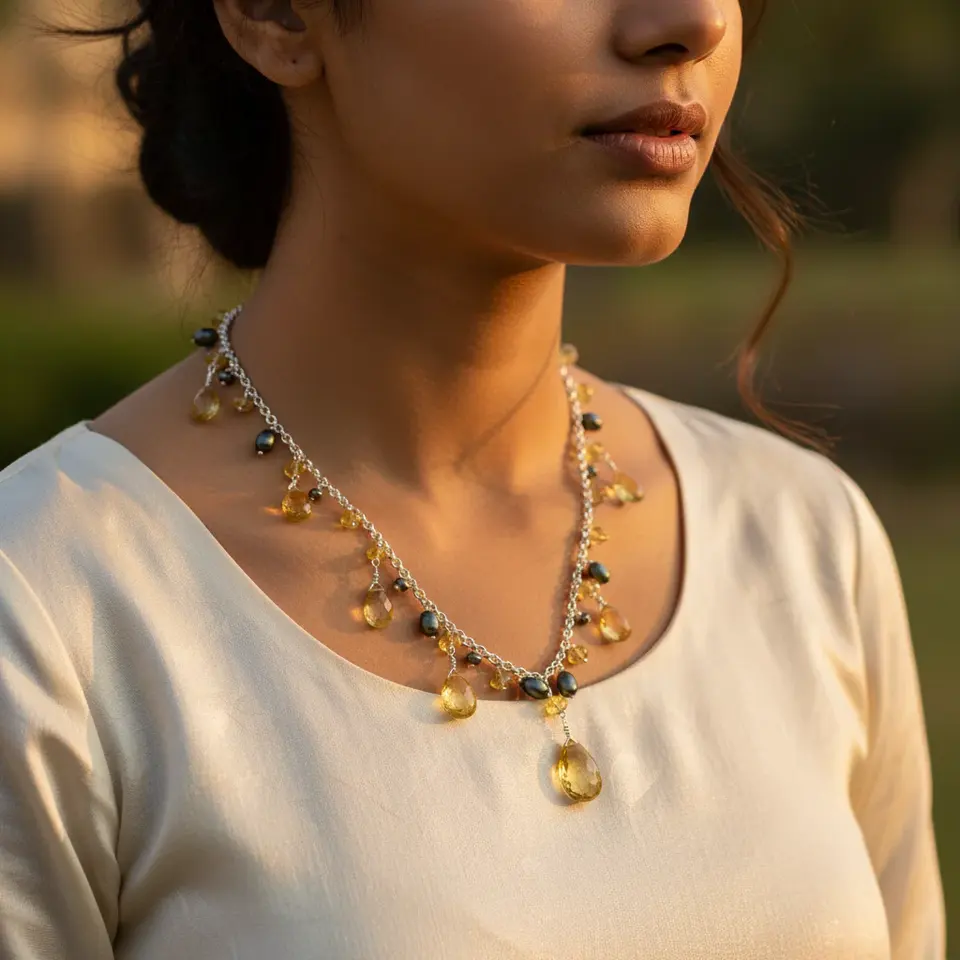 Women's Silver Citrine & Pearl Dangle Necklace Elegant Citrine Pendant on a Pearl Strand