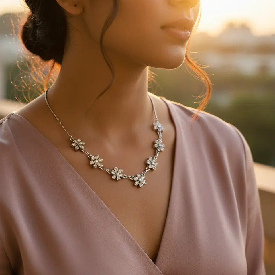 สร้อยคอคริสตัลดอกไม้สีเงินสำหรับผู้หญิง